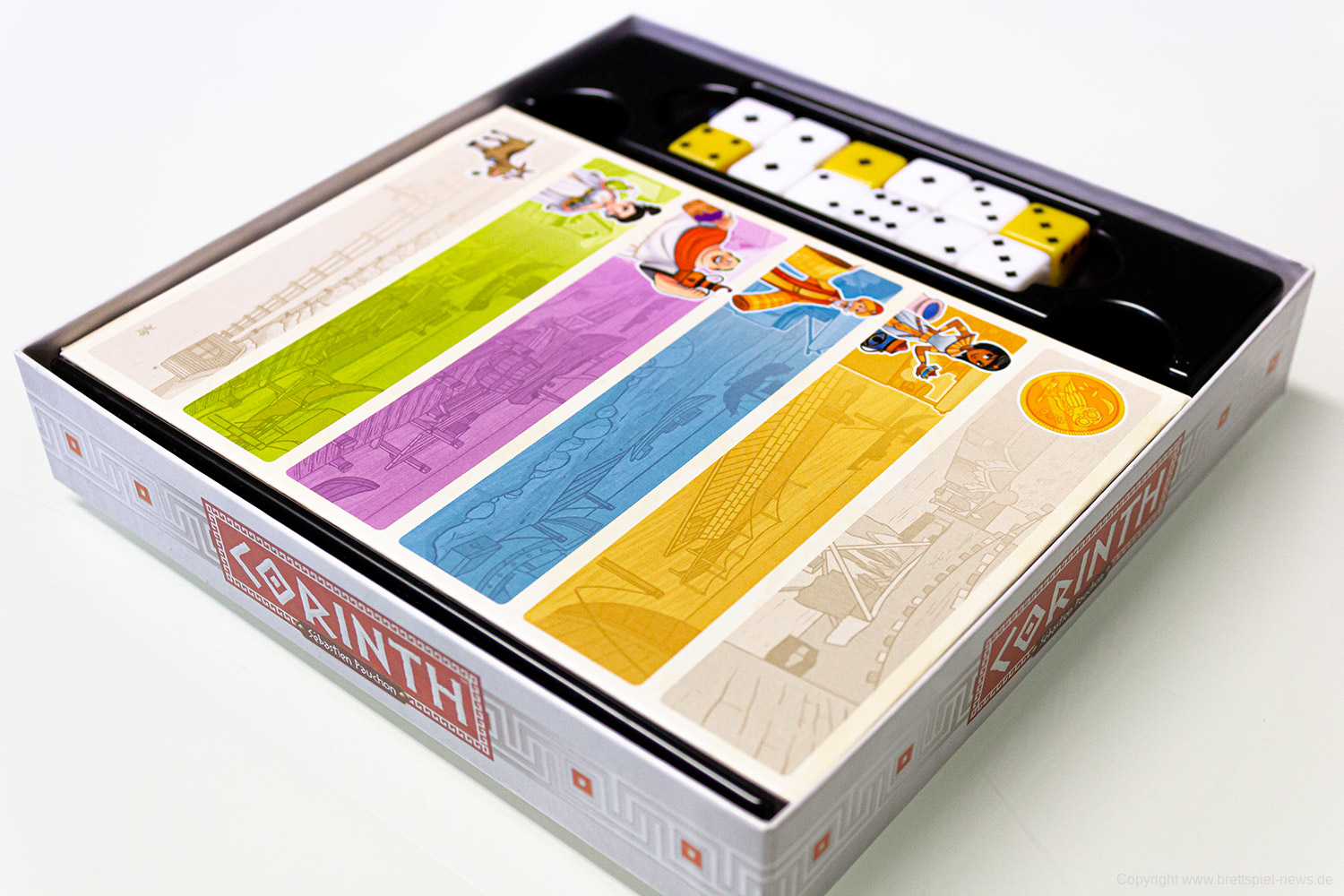 Mit „Corinth“ ist nun auch der französische Verlag Days of Wonder auf den „Roll & Write“-Zug aufgesprungen. Das Spiel für 2-4 SpielerInnen vom Autor Sébastien Pauchon kommt in einer kleinen Schachtel daher. Es liefert einen riesigen Block, ein Tableau und 12 Würfel, mit deren Hilfe das Spiel gespielt wird. Wir haben ein Exemplar von Asmodee Deutschland zur Verfügung gestellt bekommen und wie gewohnt hat das keine Auswirkung auf die Wertung des Spiels.