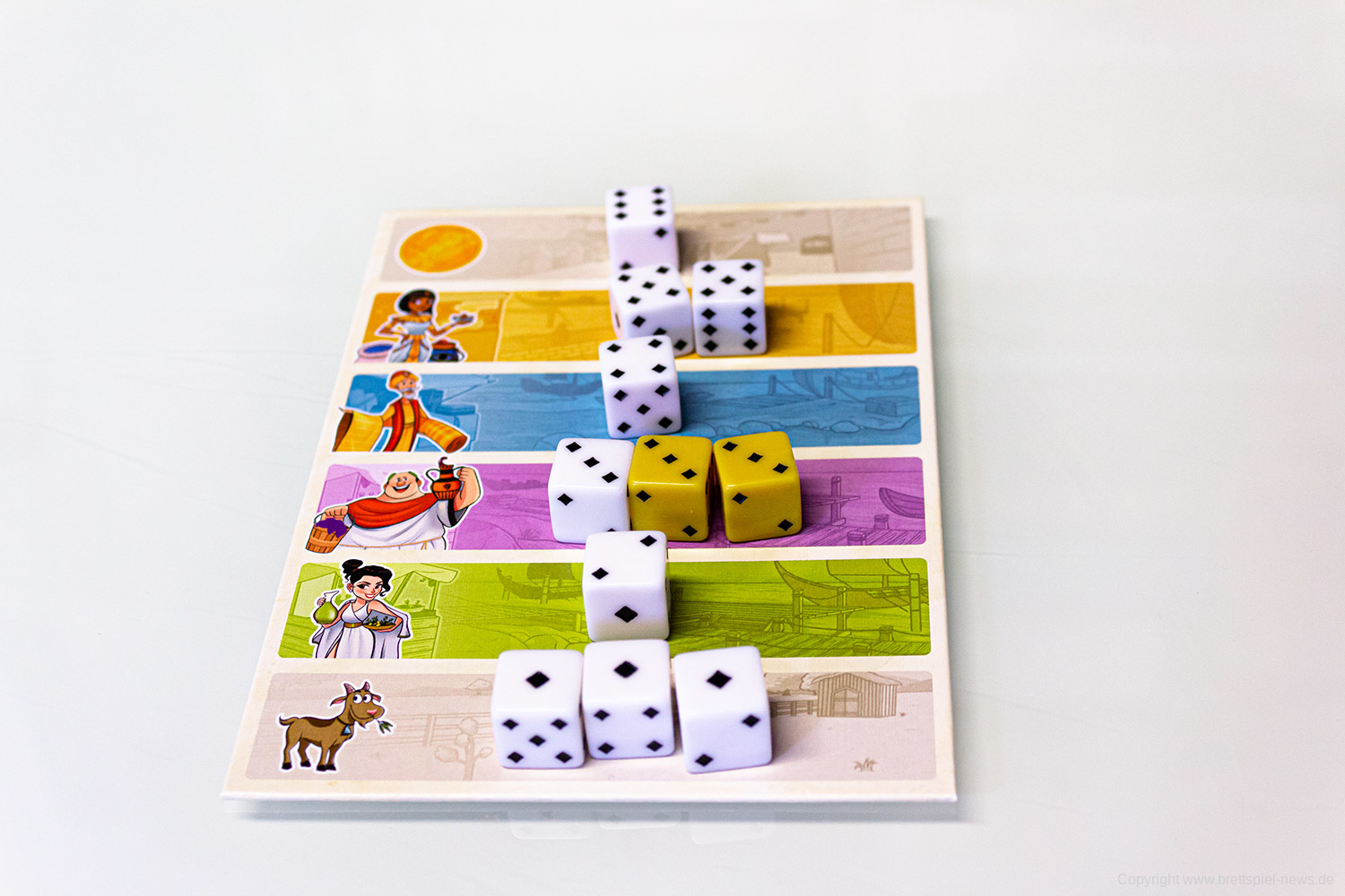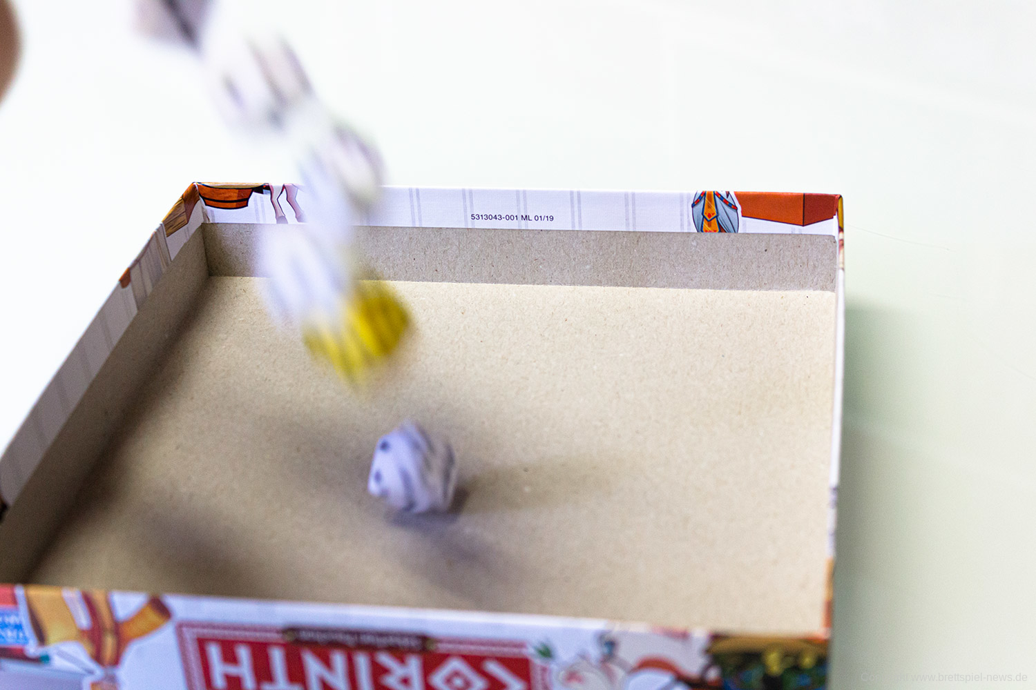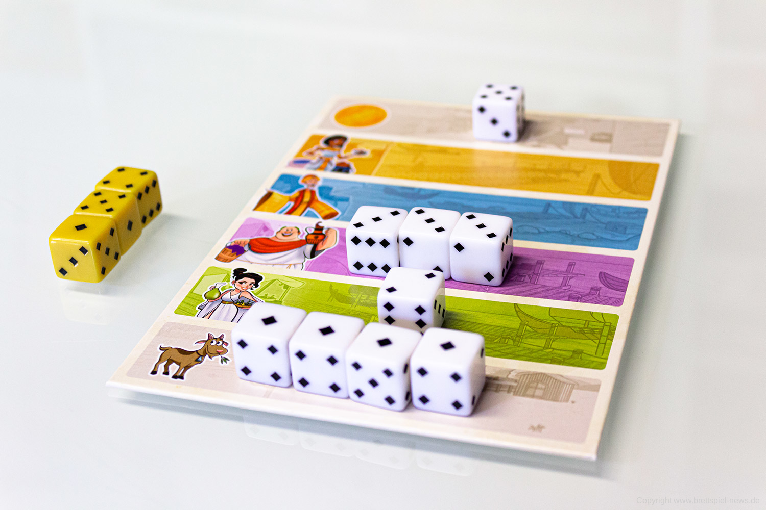 Corinth ist relativ einfach zu spielen. Der aktive Spieler würfelt und verteilt die Würfel auf dem Hafen-Tableau nach Zahlen sortiert. Die niedrigsten kommen nach ganz unten und die höchsten Würfel in die oberste Zeile.