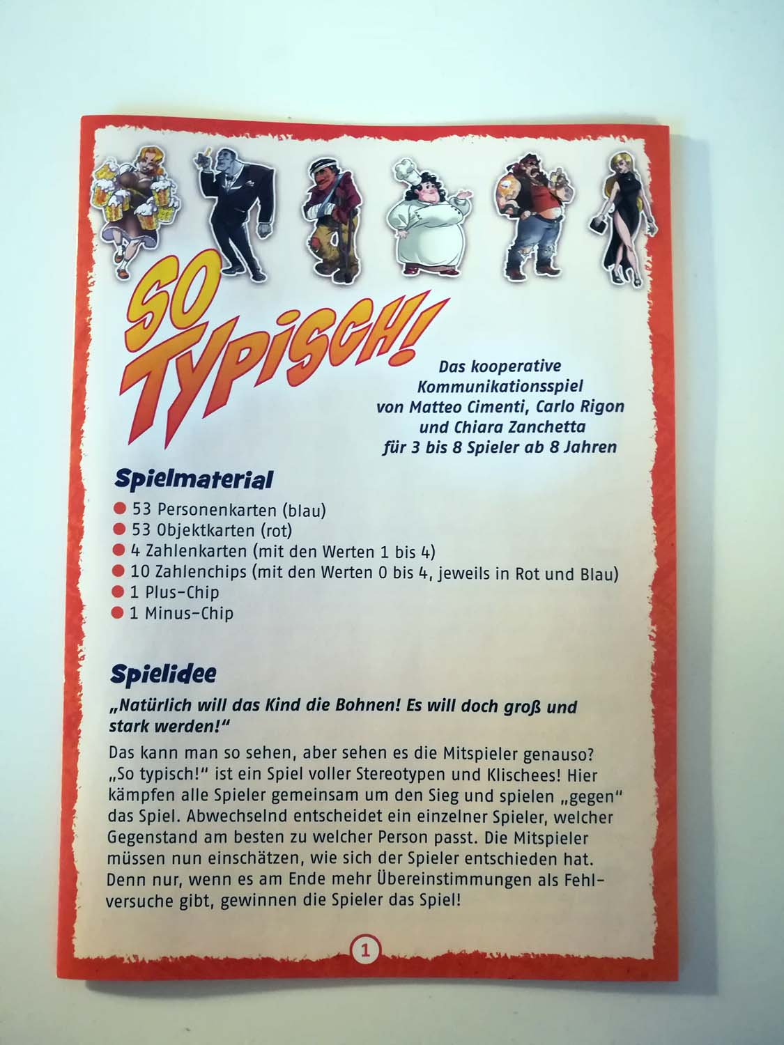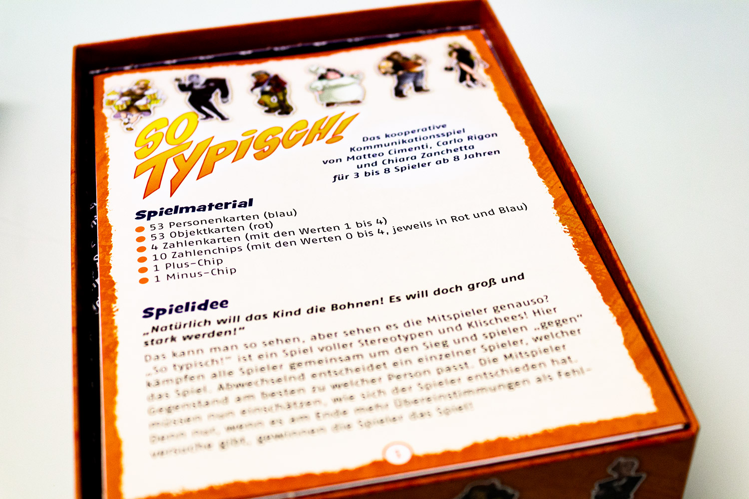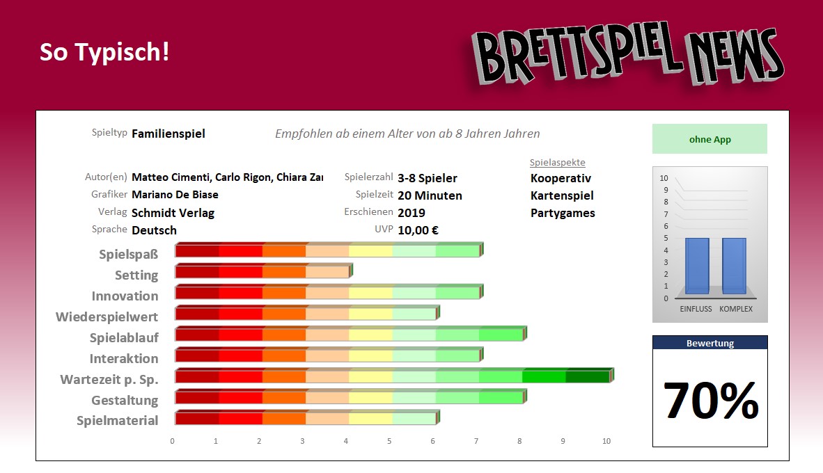 „So typisch!“ ist ein einfaches und schnell zu verstehendes Spiel. Die Karten sind sehr cool gestaltet und werden sicherlich schon beim Aufdecken für den einen oder anderen Lacher sorgen. Zwar heißt es, dass es nur mit bis zu 8 Spielern spielbar ist, man kann es aber auch ganz einfach mit mehr Leuten spielen.