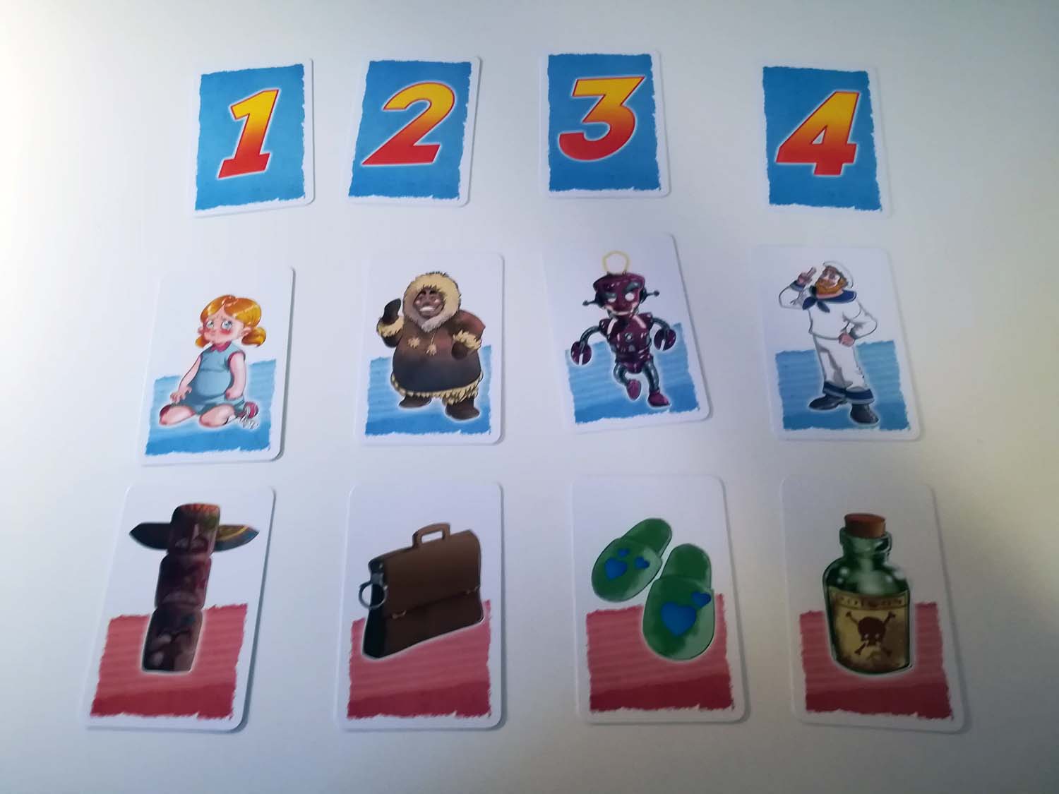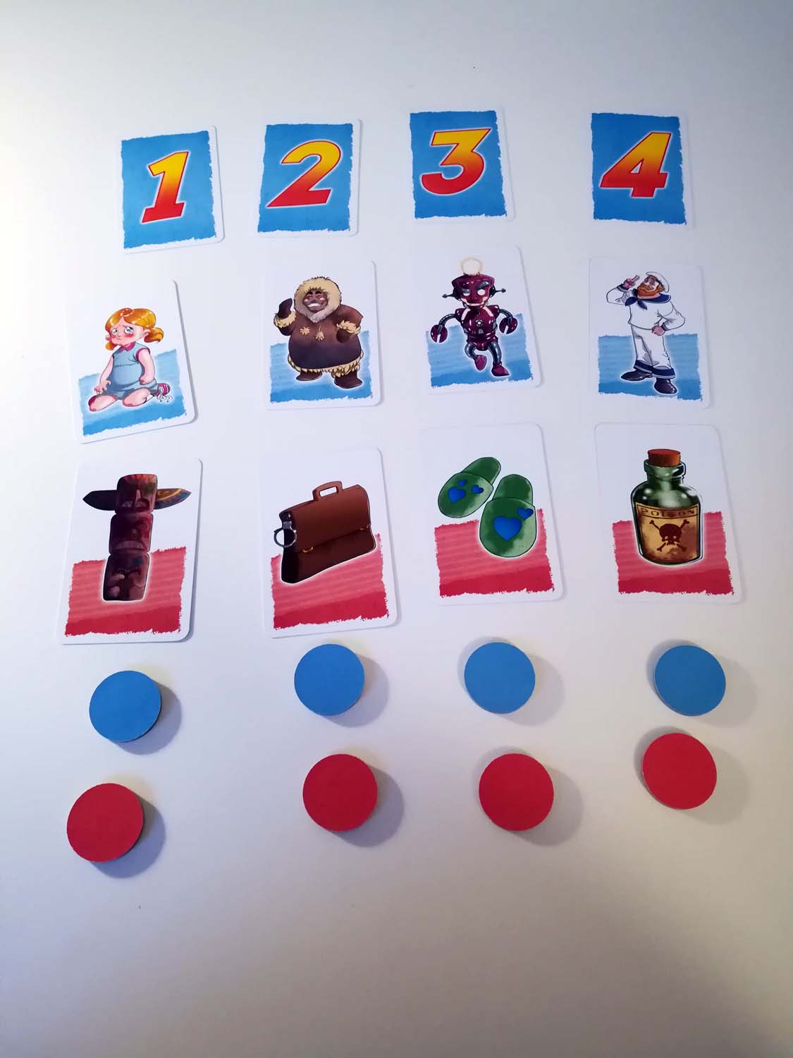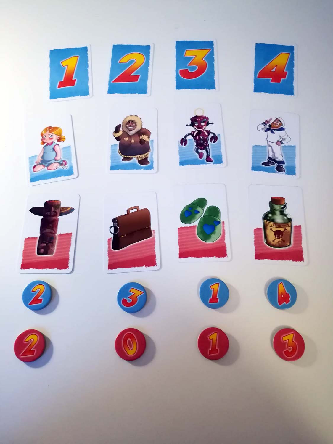 Der Ablauf ist sehr simpel. In jeder Runde gibt es einen Tippgeber und der Rest der Gruppe bildet ein Team. Nun hat man 4 Spalten, in denen jeweils eine Person und ein Objekt liegen. Der Tippgeber muss nun zuerst ein Objekt jeweils einer Person zuordnen. Glaubt er also, dass der Totempfahl in Spalte 1 am ehesten zu dem Inuit in Spalte 2 gehört, legt er unter dem Pfahl seinen Chip mit der Nummer 2 ab. So macht er es für alle Objekte. Passt ein Objekt so gar nicht zu einer der Personen, hat er auch eine 0 zur Verfügung, die bedeutet, dass dieses Objekt keiner Person zugeordnet werden kann.
