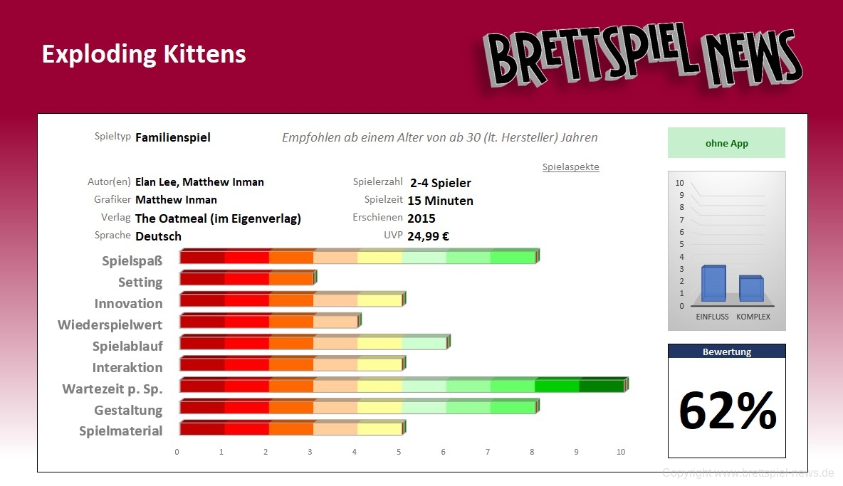 Wer ein schnell lernbares Spiel für Zwischendurch sucht ist hier genau richtig. Der Spaßfaktor ist sehr hoch (außer man zieht schon wieder diese explodierende Katze…. ;-))