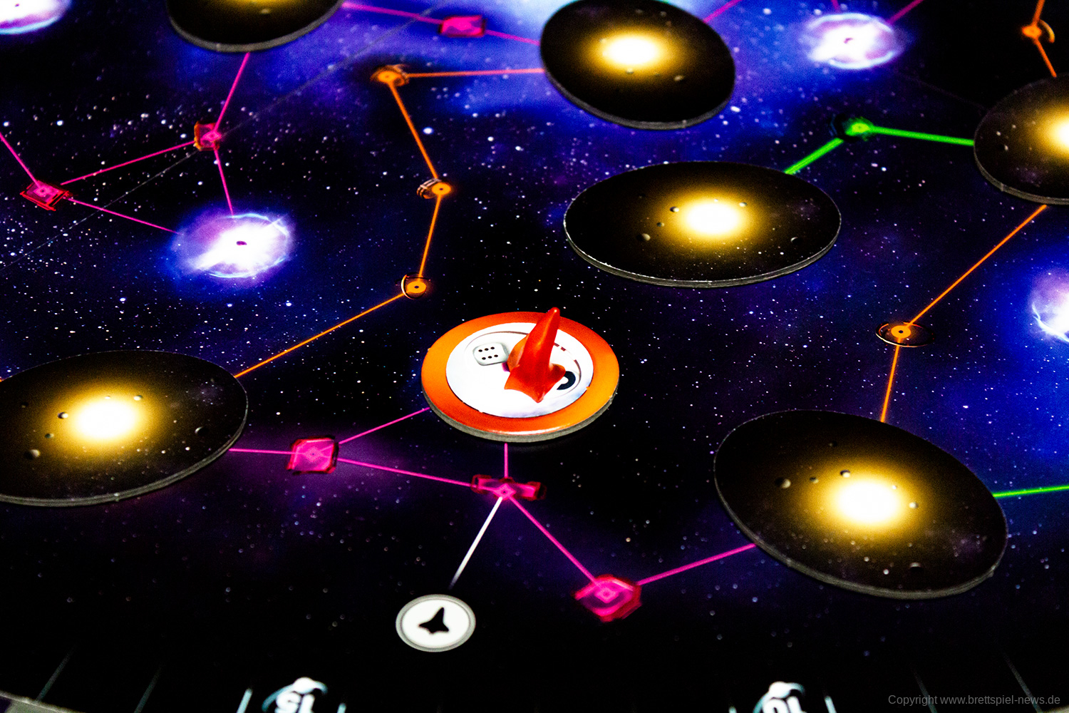 - Mit einem Erkundungsschiff fliegen // Es wird ein Würfel verwendet und das Raumschiff fliegt entsprechend der Augenzahl. Der Würfel darf manipuliert werden, sofern entsprechende Plättchen vorhanden sind. Werden Sternensysteme durchflogen, werden dieses aufgedeckt (falls sie noch nicht erkundet sind) und falls ein Mond vorhanden ist, der noch nicht belegt ist, darf ein Marker dort platziert werden. Endet die Bewegung auf einem Sternensystem, darf hingegen ein Planet belegt und der Bonus des Systems darf genommen werden. Endet die Bewegung auf einem Pulsar, darf dort ein Kreis platziert werden und falls vorhanden auch ein Gyrodyne-Plättchen gelegt werden.