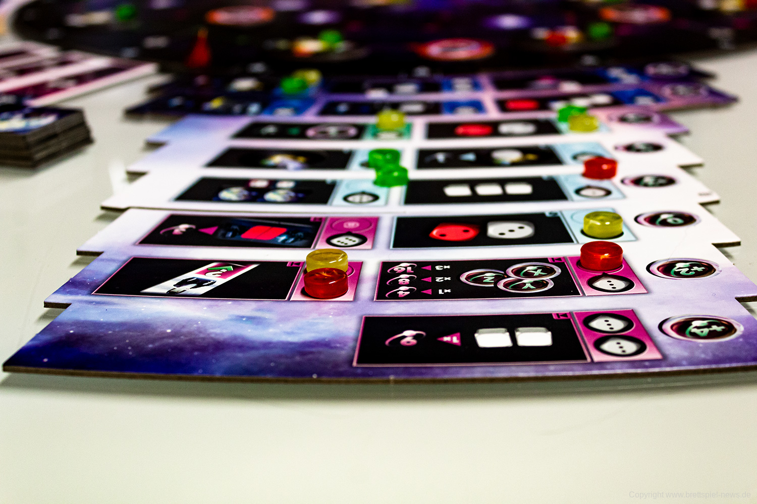Das Spielmaterial von Pulsar 2849 ist wirklich gut gelungen. Zum einen ist es weit vom üblichen Standard entfernt in Bezug auf die Form und die passgenau anlegbaren Tableaus. Aus dem Spielfeld wird eine große Spielfläche, die einen großen Tisch benötigt. Zum anderen sind die sonstigen Marker und Spielelemente durchgehend auf einem guten Niveau produziert. Die Icons sind sehr schnell verinnerlicht und das Beste dabei ist, dass das Spiel eine hohe Varianz hat. Jede Partie ist etwas anders, weil die Spielende-Ziele verschieden ausfallen und auch Technologie-Tableaus nicht nur doppelseitig bedruckt sind, sondern jedes gleich doppelt und variierend in der Box liegt.