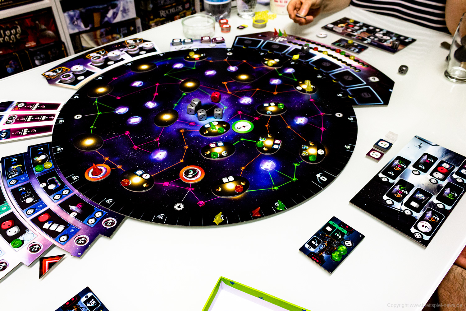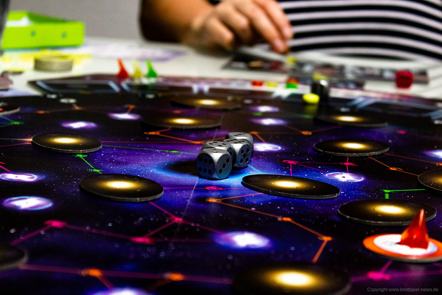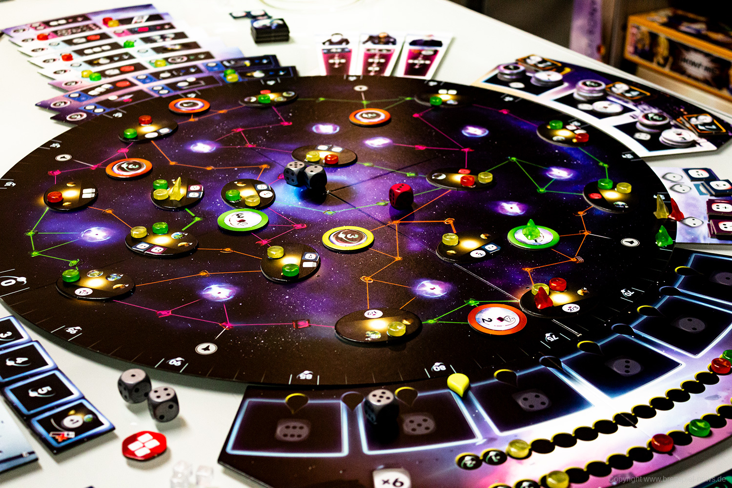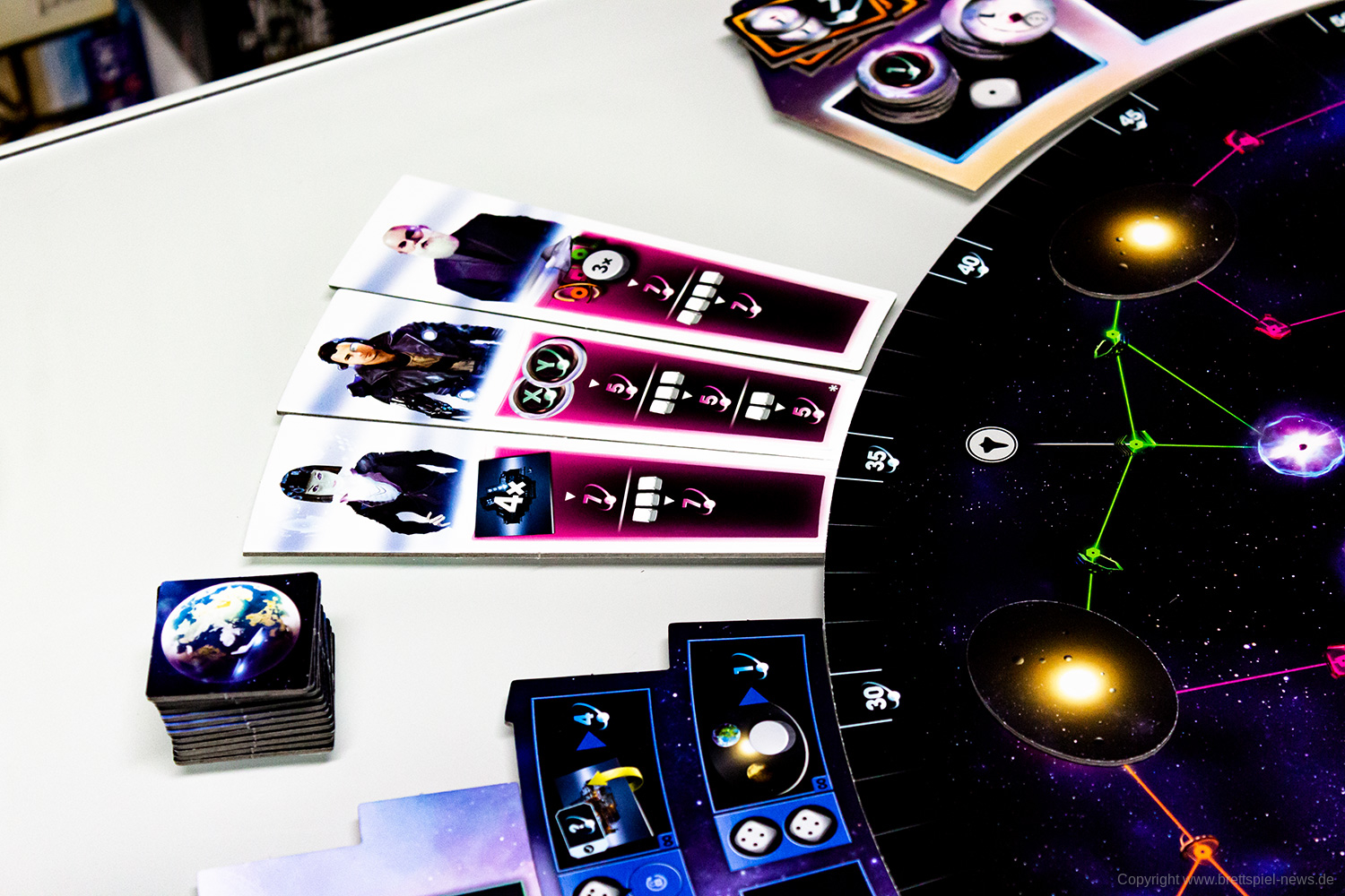 Zudem vermittelt das Spiel ein befriedigendes Gefühl, wenn man sich langsam im Universum ausbreitet, Transmitterstationen errichtet, die Boni bringen, Pulsare besetzt und Technologien erforscht. Jede/r SpielerIn wird belohnt und erhält im Laufe des Spiels immer mehr. Das eskaliert dann zum Spielende mit massig Punkten – Punktezahlen von über 200 sind theoretisch möglich, haben wir beim Spielen aber nicht erreicht.
