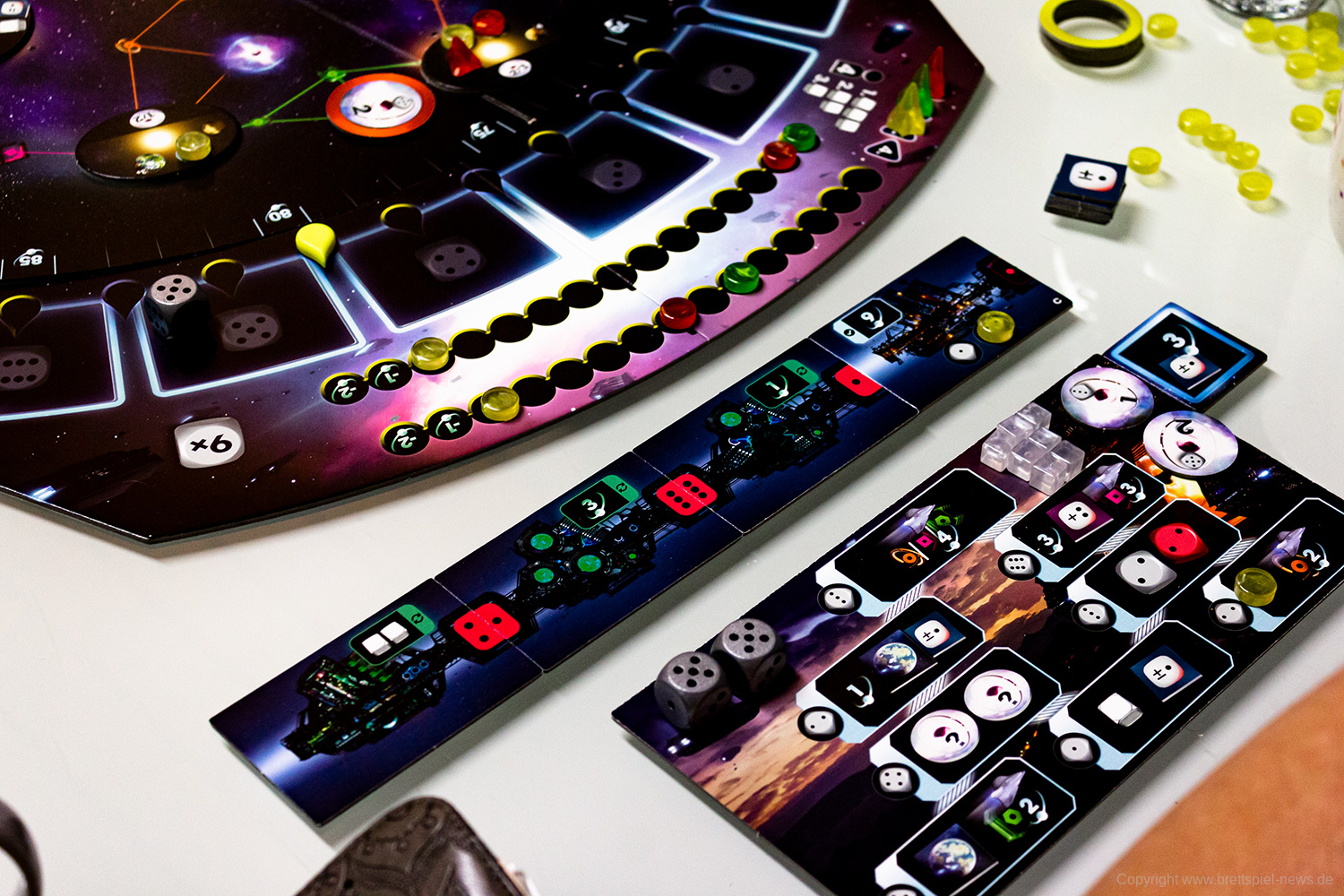 Dabei ist die Spielzeit überschaubar und die Interaktion ist durchaus groß. Zum einem kommen sich die SpielerInnen im Universum zwangsläufig in die Quere, zum anderen wird jede Runde um die Vorherrschaft gerungen, um Technik-Cubes und darum, die Spielerreihenfolge festzulegen. Nur allein vor sich hin spielen ist kaum möglich – so soll das aus meiner Sicht sein.