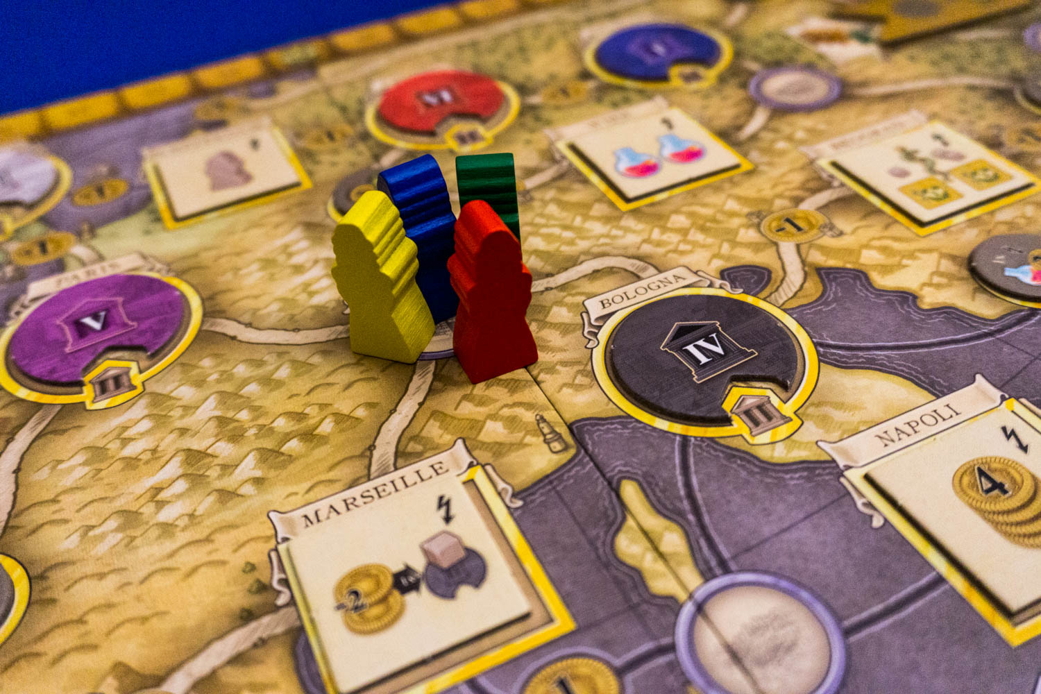 - Studieren: Bestücke dein Bücherregal! Der Spieler darf auf seinem Studientableau ein Regalplättchen belegen. Es gilt, je stärker die Aktion desto größer die Auswahl der verfügbaren Regalreihen. Die Voraussetzung des Regalplatzes muss erfüllt sein bevor es abgedeckt werden darf. Bsp.: Besuche die Universität von Bologna mit deinem Gelehrten. Für vollendete Regalreihen erhält der Spieler Siegpunkte.