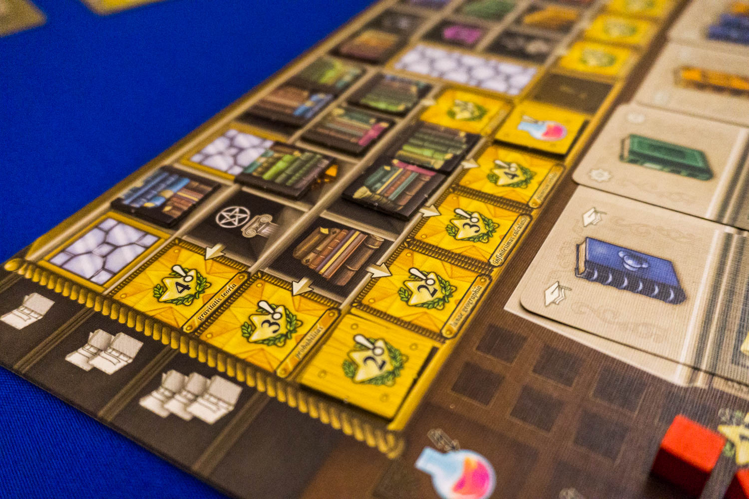- Lehrstunde: Erhalte neue Handkarten! Der Spieler darf sich eine Aktionskarte aus der Auslage nehmen. Dabei gilt es zu beachten, dass die Anzahl der auf dem Studientableau liegenden Lehrstundensymbole den Kauf stärkerer Karten ermöglicht. Die höheren Karten bringen noch weitere Soforteffekte wie Geld, Siegpunkte, Trank oder Bücher für das Bücherregal.