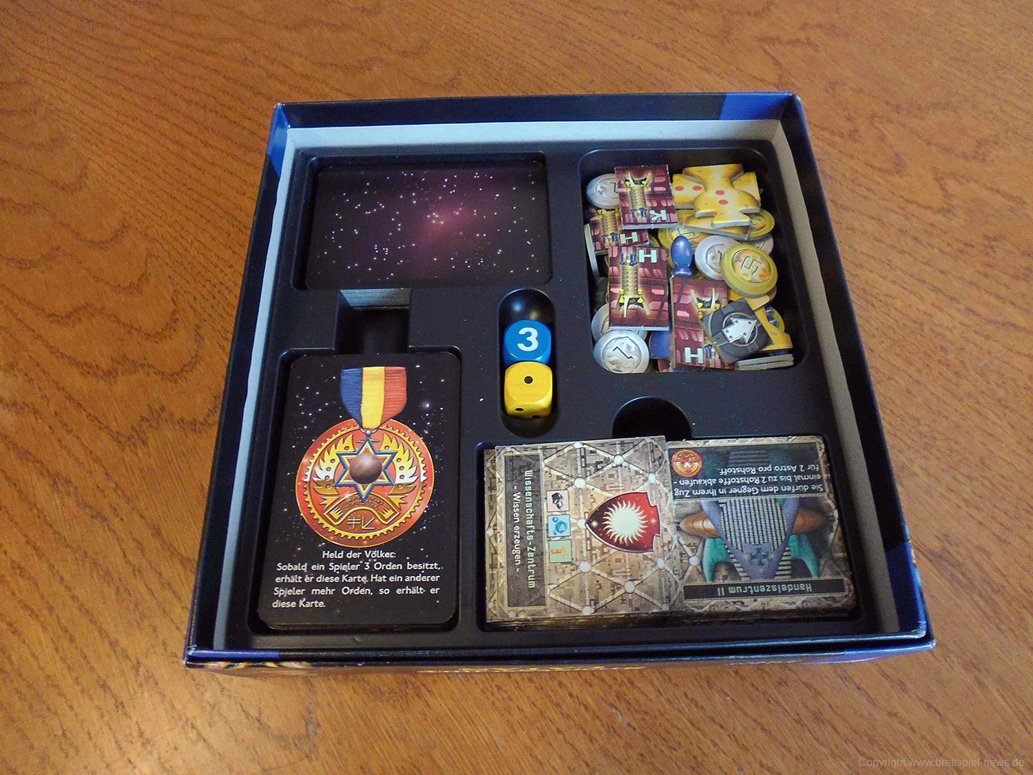 Bereits beim Unboxing der schön bedruckten Schachtel, welche sich am Design von „Die Sternfahrer von Catan“ orientiert, fallen einem die zahlreichen Karten des Spiels auf. Diese haben KOSMOS-typisch eine gute Qualität und bestechen durch gut sichtbare und verständliche Symbolik. Gleiches gilt auch für die Anleitung, welche mit zahlreichen Beispielen aufwartet und nach dem ersten Lesen keine Fragen auflässt. Wem das zu anstrengend ist, kann sich das Spielgeschehen auch weitestgehend von Prof. Easy in einer Einführungspartie erklären lassen. Farblich ist das Spielmaterial in einer Mischung aus düsterem Schwarz und bunten Tönen gehalten. Die beiden Sternenschiffe, welche als Tableau dienen, haben eine ansprechende Dicke und sind trotz der verspielten Gestaltung noch übersichtlich genug. Dazu gesellen sich noch griffige Tokens, welche entweder als Anzeiger im Lager fungieren oder die imaginäre Währung Astro repräsentieren. Von diesen Astros sind genügend beigelegt, sodass es nie zu einer Verknappung kommt. Besonders schön anzusehen sind die Bordkanonen und Antriebe, welche aber leider nicht immer in die angedachten Steckplätze passen wollen. Immerhin passen all diese Materialien dafür optimal in den praktischen Schachteleinsatz.