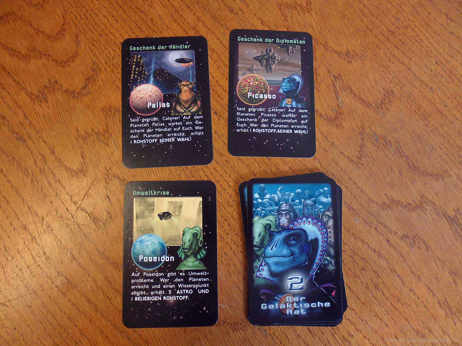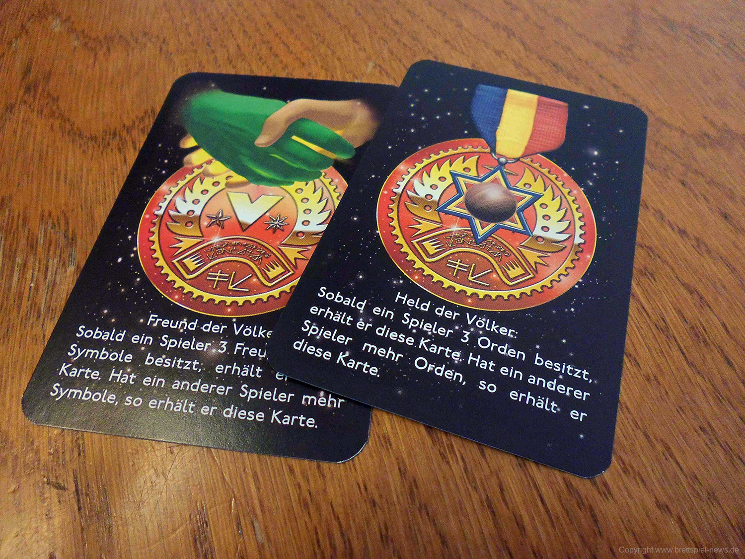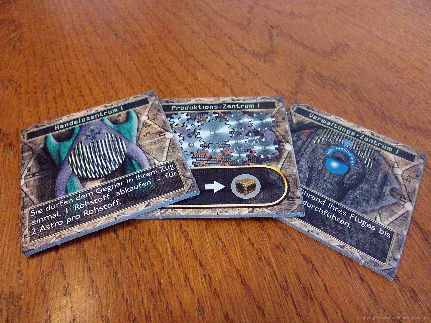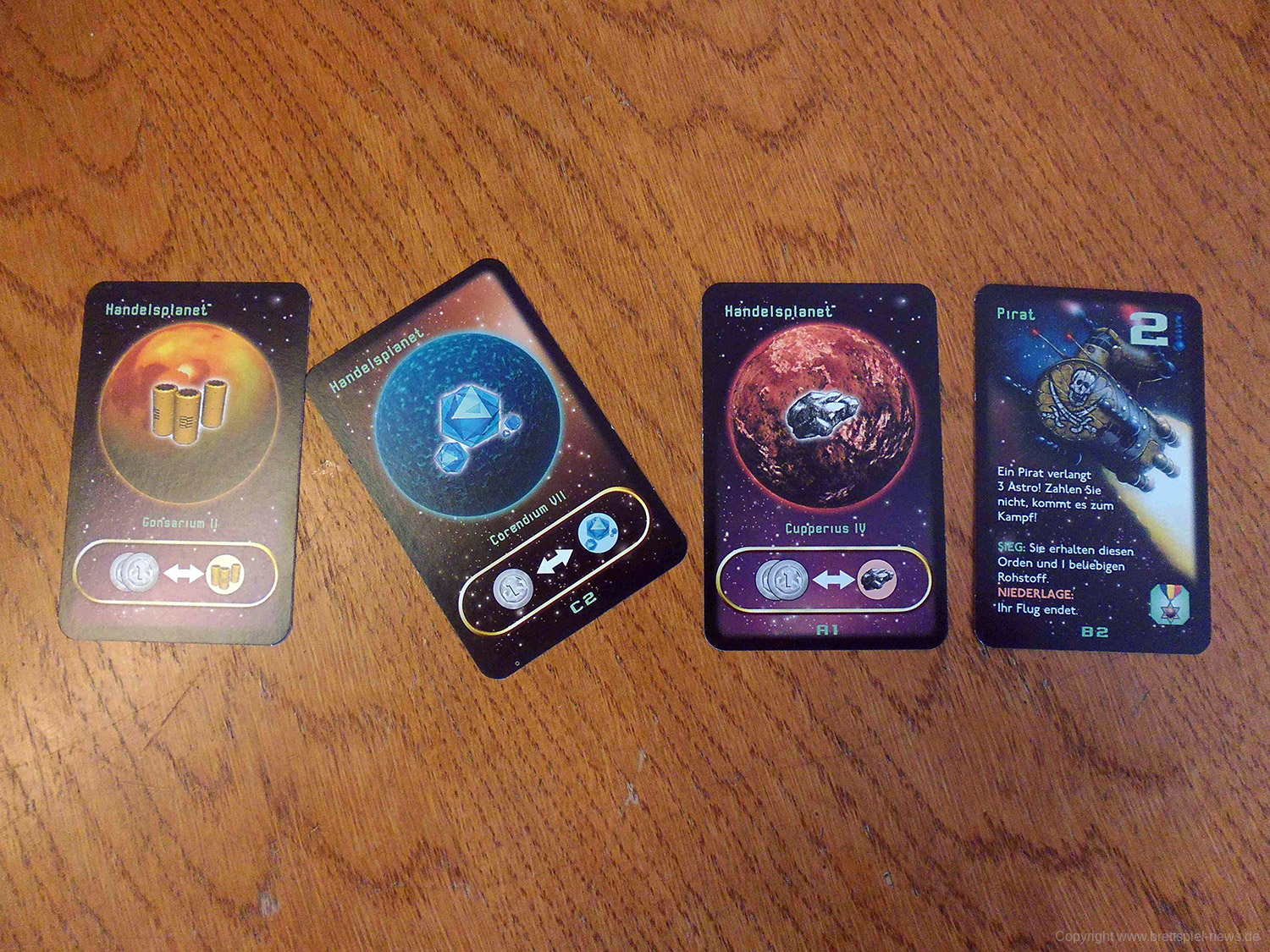 Danach folgt die Flugphase, welche sicherlich das Herzstück des Spiels ausmacht. Hier kommt der eben geworfene Würfel nochmals zum Einsatz, da seine Augenzahl die Grundgeschwindigkeit des Raumschiffs darstellt. Addiert man hierzu die Anzahl der Antriebe, weiß man, wie weit man diesmal ins All vordringen kann. Das All selbst wird in „Sternenschiff Catan“ durch vier gleich große Kartenstapel repräsentiert. Je nach Fluggeschwindigkeit wird nun nacheinander die entsprechende Zahl an Sektorenkarten vom Mitspieler aufgedeckt und man selbst entscheidet, ob die abgedruckte Aktion ausgeführt werden soll oder nicht. Die Aktionen umfassen das Handeln mit anderen Völkern, die Gründung neuer Kolonien oder Handelsstationen, Aufgaben des galaktischen Rates oder Piratenangriffe. Letztere müssen immer ausgeführt werden und stellen eine Art Würfelduell dar, welches man durch das Zukaufen von Bordkanonen auch beeinflussen kann. Dies bringt einem letztlich sogar ab einer bestimmten Zahl von Medaillen die Auszeichnung „Held der Völker“ und somit einen zusätzlichen Siegpunkt ein. Kolonien und Handelsstationen können nur dann gegründet werden, wenn die benötigten Ressourcen im Lager vorhanden sind und man außerdem ein entsprechendes Beischiff abgibt. Wie immer im CATAN-Universum sind es diese Bauten, welche hauptsächlich Siegpunkte generieren. Aufgaben des galaktischen Rates können meist durch Abgabe von Rohstoffen oder das Erfüllen bestimmter Bedingungen abgeschlossen werden. Auch sie führen neben kleineren Boni letzten Endes dazu, ein „Freund der Völker“ zu werden, was weitere Siegpunkte liefert. Die Flugphase endet, sobald der aktive Spieler zwei dieser Aktionen getätigt hat, freiwillig stoppt oder gegen einen Piraten verloren hat. Dabei wird der Stapel gegebenenfalls aufgefüllt und am Ende grünlich gemischt. Es lohnt sich also für beide SpielerInnen, sich zu merken, in welchem Stapel sich die lukrativsten Karten befinden.