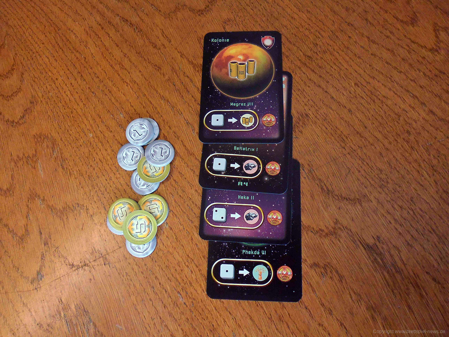 In der Produktionsphase wird CATAN-typisch ein Würfel geworfen und auf Basis der eigenen Kolonien und Zentren die Rohstoffe an beide SpielerInnen verteilt. Diese werden im weiteren Verlauf der Runde zum Handeln und Kaufen benötigt.