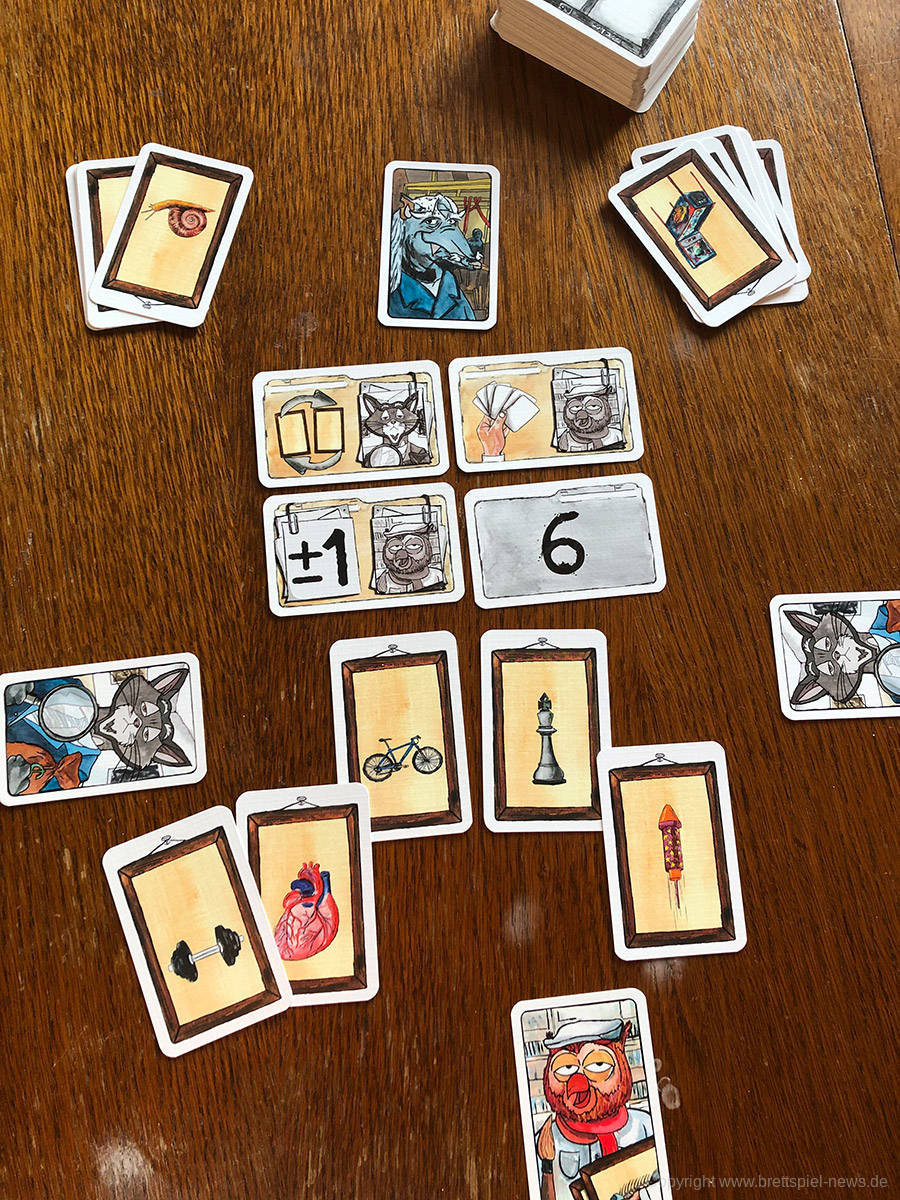 Pro Spieler gibt es zwischen 6 und 18 Hand-/Themenkarten (je nach Anzahl der Spieler), auf denen Bilder wie Fußball, eine Angel, eine Feder, o.Ä. zu sehen sind. Weiterhin erhält jeder Spieler eine Rollenkarte, entweder Maler Eule oder Museumsleiter Katz. Nun werden zwei weitere Themenkarten genommen und offen auf den Tisch gelegt. Diese spiegeln das „Thema“ des Museums wieder. Die Museumsleiter fordern im weiteren Spielverlauf zu diesem Thema Bilder von den Malern ein. Die Spieler mit der Rolle Museumsleiter können nun eine Anzahl zwischen 2 und 7 Bildern /Handkarten fordern. Die Maler dürfen sich nun abstimmen, wieviele „passende“ Karten Sie haben. Gemeinsam müssen sie die geforderte Anzahl an Karten verdeckt hinlegen. Diese werden mit 4 verdeckten Karten vom Nachziehstapel gemischt, sodass die Museumsleiter nicht mehr wissen, welche Karten von den Malern kommen.