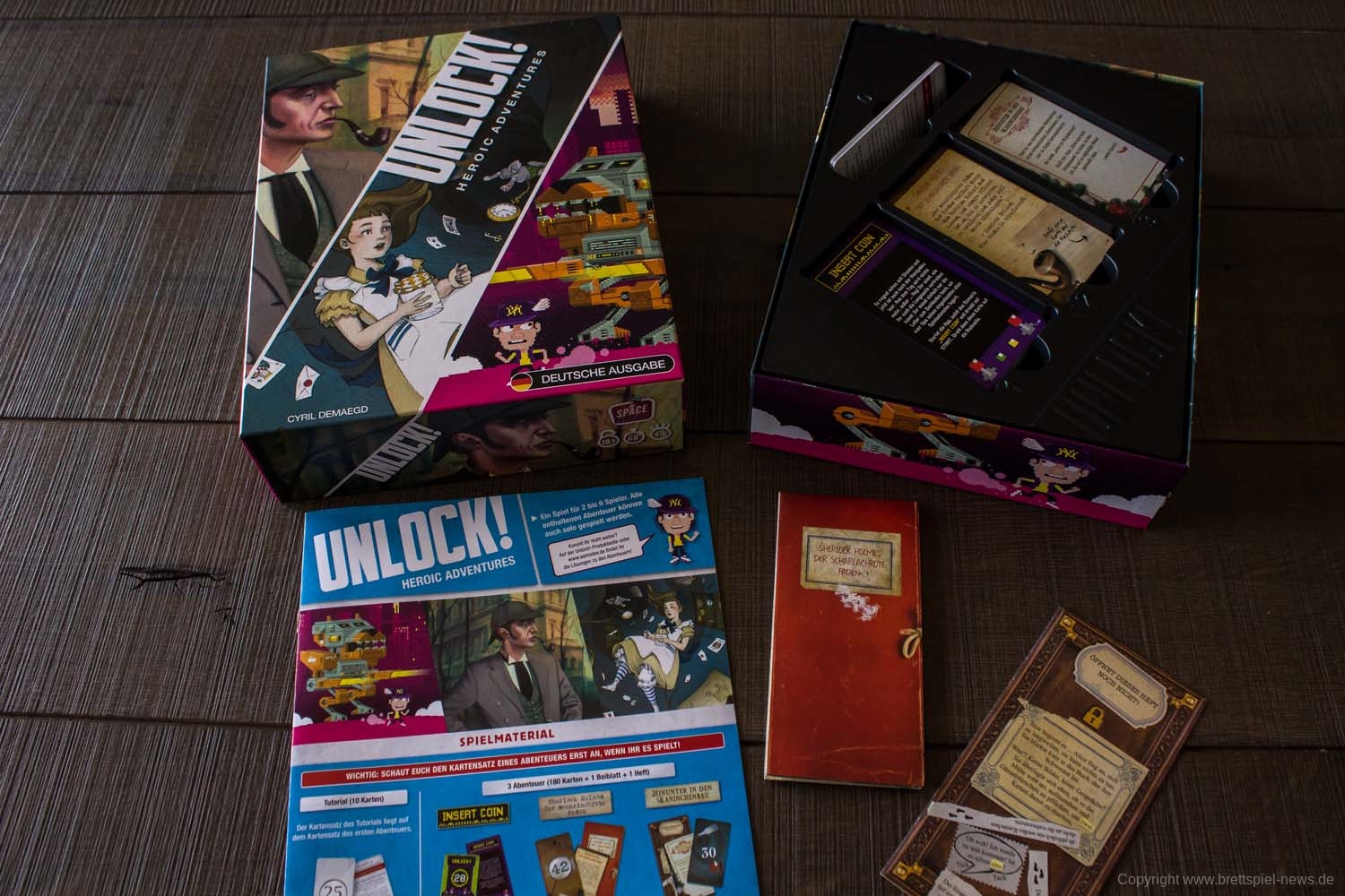 Mit UNLOCK! HEROIC ADVENTURES geht die beliebte Reihe aus dem Ideenfundus von Space Cowboys in die nächste Runde. Diesmal sind die drei Rätselabenteuer rund um Helden aufgebaut. Aus dem literarischen Bereich sind dies Meisterdetektiv Sherlock Holmes und Alice aus dem Wunderland, ergänzt um einen generischen Helden im Pixelgewand.