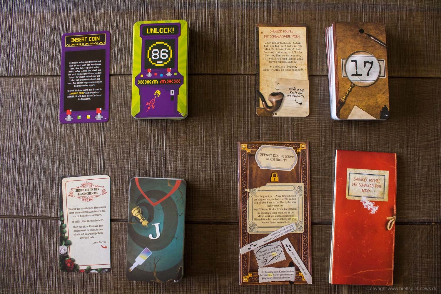 Wie gewohnt besteht das Spiel aus 3,5 Kartensätzen. 3 komplette Sätze für jedes Abenteuer und einem kleineren Satz für das Einführungsspiel, das UNLOCK-Fans bereits seit dem ersten Spiel bekannt sein dürfte. Diesmal gibt es zusätzlich zu den Karten noch zwei große Faltbögen aus Papier, die zum Lösen von SHERLOCK HOLMES – DER SCHARLACHROTE FADEN und HINUNTER IN DEN KANINCHENBAU erforderlich sind. Das Material ist den Anforderungen an ein einmaliges Spiel mehr als gewachsen und auch das Weiterreichen an Freunde und Bekannte dürfte kaum große Abnutzungseffekte zu Tage fördern.
