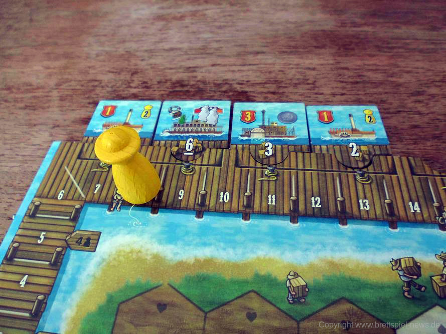 Jetzt ist es endlich soweit und die Ernte wird eingefahren und verkauft. Dafür wählt man im New Orleans-Teil des Spielfeldes ein Flussboot aus, welches man sofort mit der aufgedruckten Anzahl an gleichen Ackerfeldfrüchten beladen muss. Die Flussboote selbst bringen einem Siegpunkte, Anschaffungen, erlauben das Weiterziehen des Hafenmeisters auf dem eigenen Tableau oder das Einsetzen von Kommissionären. Der Hafenmeister ist eine Figur, die immens wichtig ist für die Endwertung. Das liegt daran, dass nur diejenigen Flussboote am eigenen Tableau gewertet werden, bis zu welchen der Hafenmeister an den Stegen auch gekommen ist. Außerdem erhält nur der Spieler, dessen Hafenmeister am weitesten bewegt wurde, die volle Punktzahl. Alle anderen müssen ihrer Siegpunkte am Schluss nämlich halbieren. Ein ähnlicher Wettlauf findet auch mit den Kommissionären statt. Für deren Rekrutierung können die SpielerInnen eigene Arbeiter nach New Orleans schicken, wo sie bis zum Schluss verbleiben. Wer hier die meisten Kommissionäre hat, kann dank seines Einflusses nochmals mit satten Boni rechnen.
