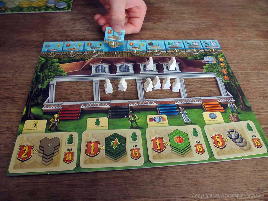 Wie bereits oben erwähnt, thematisiert Riverboat den Anbau und Verkauf von Gemüse an Amerikas wohl bekanntestem Fluss. Ziel der SpielerInnen ist es dabei, möglichst erfolgreich zu taktieren und am Ende einer Partie die meisten Siegpunkte zu erwirtschaften. Jede Partie geht über vier Runden, welche ihrerseits aus fünf Phasen bestehen. Eine Phase umfasst immer eine damit verknüpfte Aktion, welche die SpielerInnen reihum ausführen. Anders als in vielen vergleichbaren Spielen wechselt der Startspieler nicht nach Ablauf einer Runde, sondern bereits nach jeder Phase. Welcher der Kontrahenten wann StartspielerIn ist, wird vor der Runde festgelegt, indem abwechselnd die fünf Phasenplättchen verteilt werden. Dabei bringt jedes Phasenplättchen zu Beginn der Phase auch einen kleinen Vorteil. In den folgenden Abschnitten möchte ich euch nun die einzelnen Phasen grob vorstellen, um euch einen besseren Eindruck vom Spielgeschehen zu vermitteln.