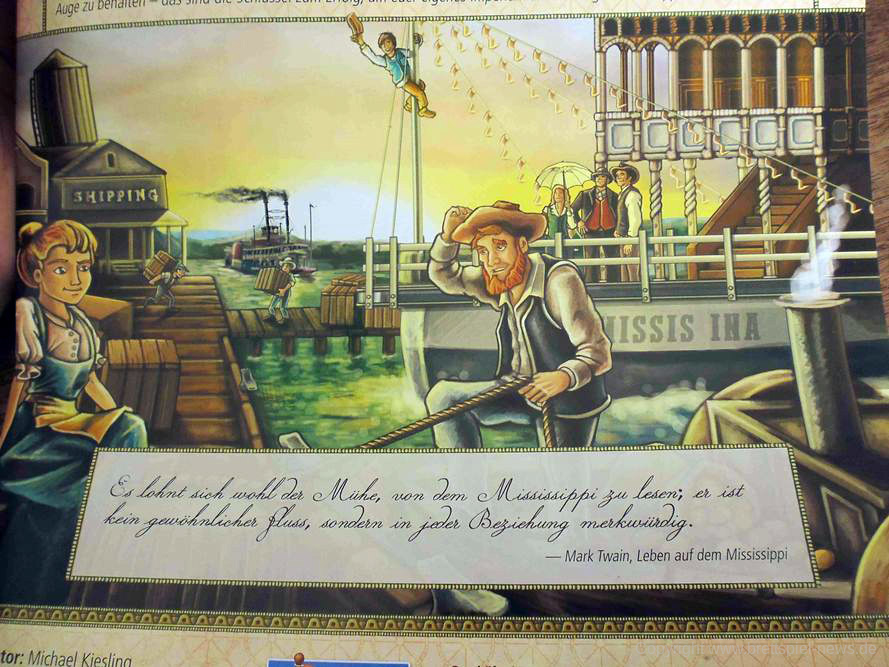 Schon die Coverart der Box vermittelt mit seinen Farben und der malerischen Landschaftsabbildung einiges an Atmosphäre. Typisch für Lookout Spiele ist die Box ausreichend groß und gut gefüllt. Außerdem macht sie einen wertigen und stabilen Eindruck. Im Innern verstecken sich zahlreiche Holzfiguren, Plättchen, Tokens und einige Karten, die sich in ausreichend Zip-Beuteln verstauen lassen. Alle Materialien sind ausreichend dick und sollten daher selbst nach längerer Zeit nicht stark abnutzen. Beim Lesen der Anleitung stellt man schnell fest, dass hier Profis am Werk waren. Die Regeln sind verständlich geschrieben und bis auf wenige Ausnahmen klar strukturiert. Darüber hinaus bietet sie anschauliche Beispiele, welche bei Unklarheiten Abhilfe verschaffen. Zusätzlich finden sich auf einigen Seiten Zitate von berühmten Autoren, welche sich in ihren Werken mit dem Mississippi beschäftigt haben. Aber genug Worte verloren. Es ist Zeit, den Blick wieder zu weiten und beim Fazit anzulangen.