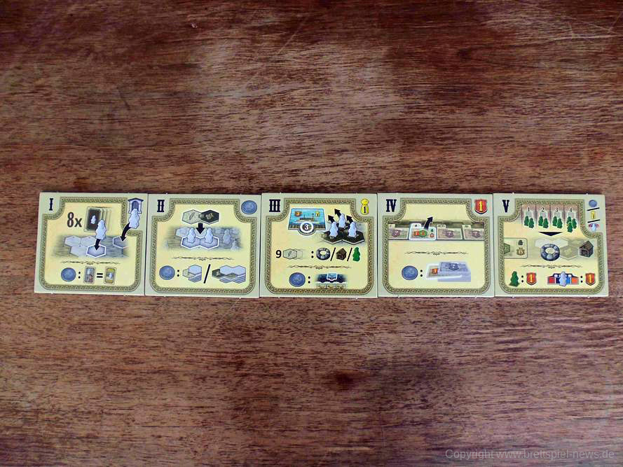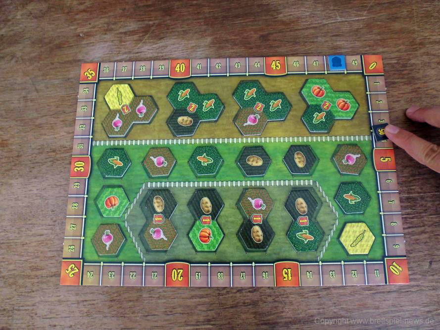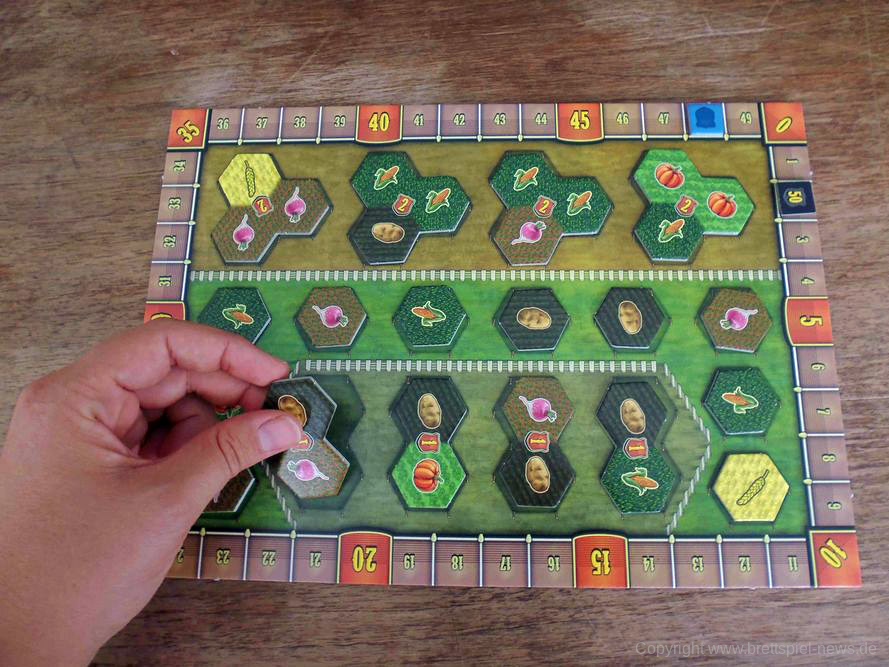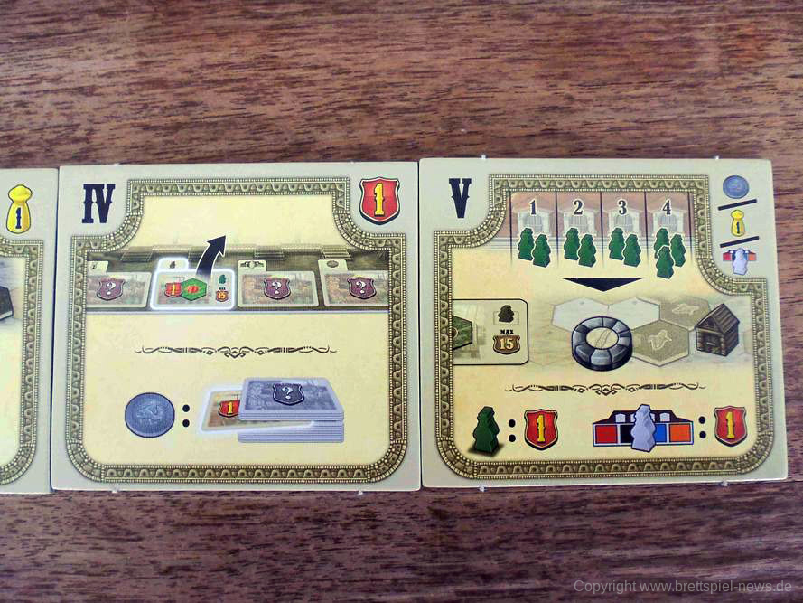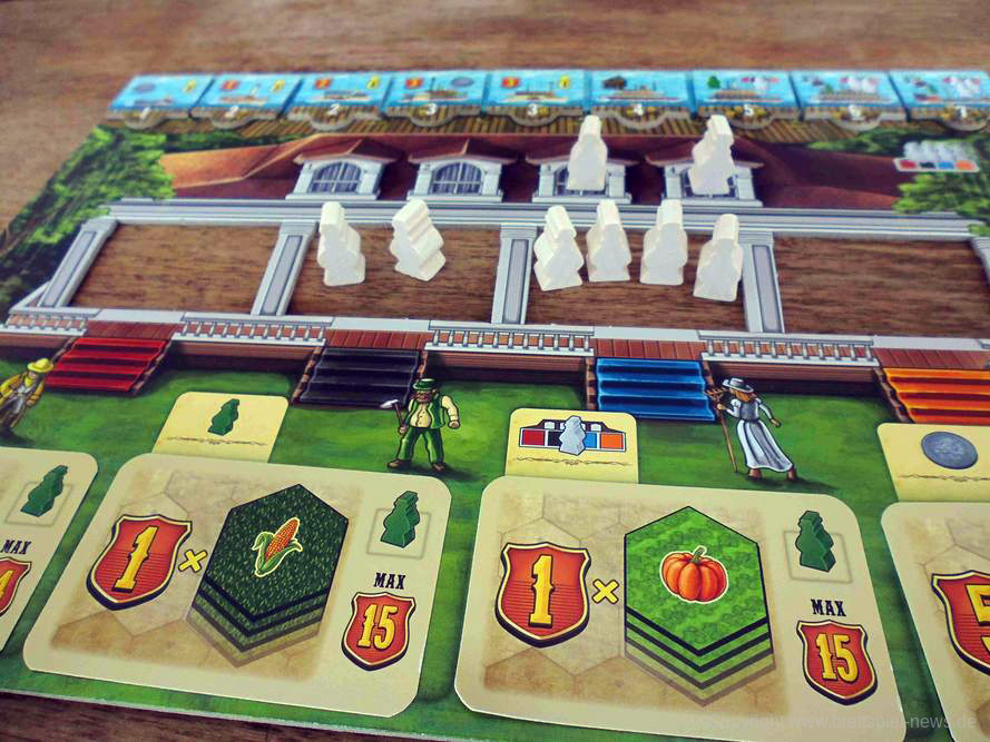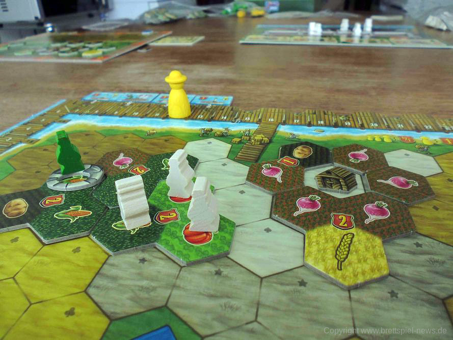 Abzüge gibt es jedoch in der B-Note. Im Allgemeinen legt das Spielbrett aus meiner Sicht eher Wert auf Funktionalität und greift die Hintergrundgeschichte des Spiels nur am Rande auf. Ohnehin wirkte die Thematik für alle Anwesenden am Tisch eher austauschbar. Schade eigentlich, denn spätestens die liebevollen Flavour-Texte in der Anleitung haben mehr erwarten lassen. Das ist aber weniger schlimm als andere gestalterische Mängel. So ist die Farbwahl bei der Auslage von Ackerfeldfrüchten sowie die zugehörige Symbolik definitiv danebengegangen. Gerade bei schlechtem Licht lassen diese sich nämlich nur schwer unterscheiden. Bei den Schiffsplättchen (2er und 3er) ist es zudem jedes Mal vor Beginn ein Kampf, diese auseinander zu dröseln. Ein Sortiersystem hätte hier Abhilfe geschaffen. Aufgrund der Größe der Plättchen ist die Handhabung ebenfalls unnötig frickelig. Das haben andere Spiele aus dem Verlag schon besser gelöst bekommen.