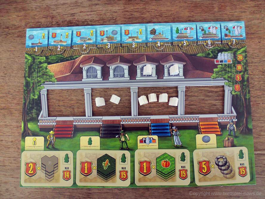 Kann sich Riverboat nun wie ein Schaufelraddampfer aus der grauen Masse an Strategiespielen herausheben oder versumpft das Ganze im Niemandsland? Bei der Spielmechanik jedenfalls lässt sich ein alter Hase wie Michael Kiesling natürlich nicht lumpen. Mir persönlich hat die Mischung aus Workerplacement, ein klein wenig Puzzle, Glückselementen und dem stetigen Wettlauf gegen die Konkurrenz jedenfalls einiges an Spaß bereitet. Interessant fand ich vor allem, dass der Startspieler durch das Verteilen der Phasenkarten ständig wechselt und man so bereits vor Rundenbeginn genau planen muss, welche Vorteile und Aktionen einen am ehesten ans Ziel bringen. Das sorgt für Dynamik im Spielablauf, welche auch durch die geringe Downtime unterstützt wird. Da die Auslage immer wieder anders aufgebaut wird, ist ein stetiger Wiederspielreiz ebenfalls gegeben. Auch das Spielmaterial weiß größtenteils zu überzeugen, auch wenn man mit heutigen Kickstartern qualitativ nicht mithalten kann. Zusammen mit der einigermaßen hohen Interaktion, die durch das ständige Wegschnappen von Plättchen und Karten garantiert ist, ergibt sich mir also ein stimmiges und logisches Gesamtbild.