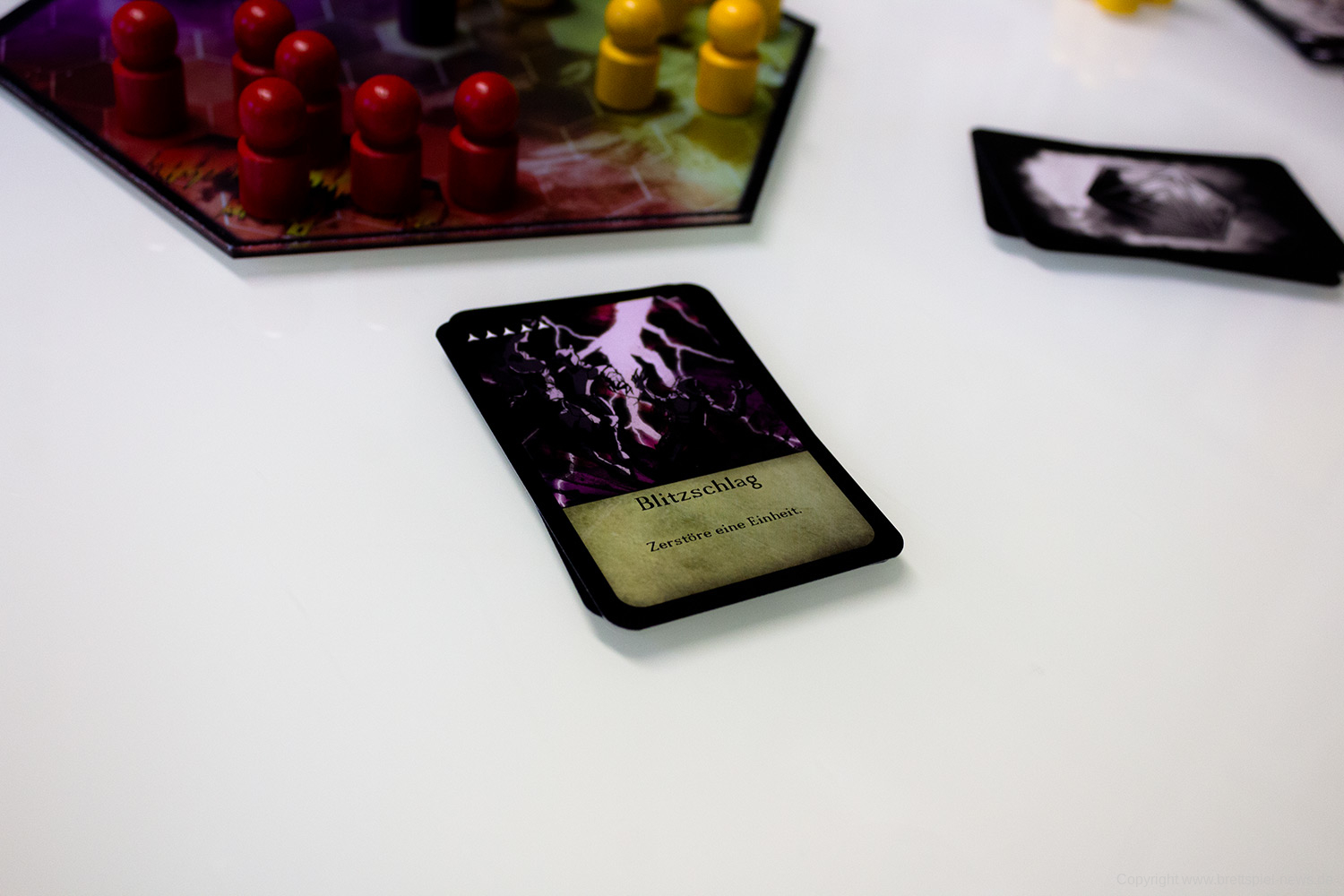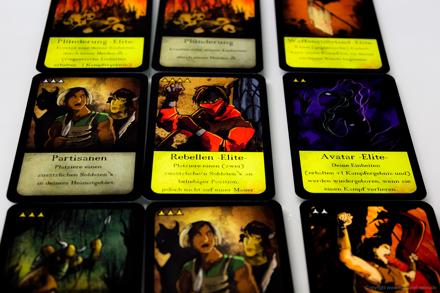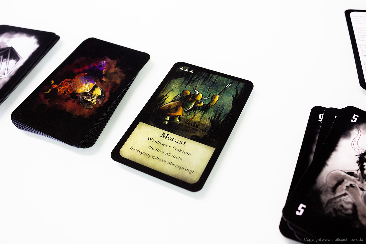 Tatsächlich bringt die kleine schwarze Schachtel mit dem Branding reichlich viel Innovation mit. Es funktioniert tatsächlich gut, zu dritt zu spielen und die Einheiten der Fraktionen branden auf dem Spielfeld aufeinander, um sich zu bekämpfen. Die Kämpfe sind durchaus spannend, gerade am Anfang, lässt sich die Stärke des Kontrahenten nur schwer einschätzen. Zusätzlich bringen vor allem die Aktionskarten starke Momente ins Spiel.