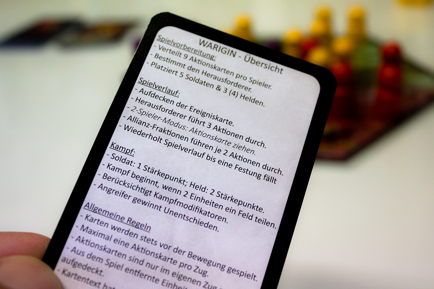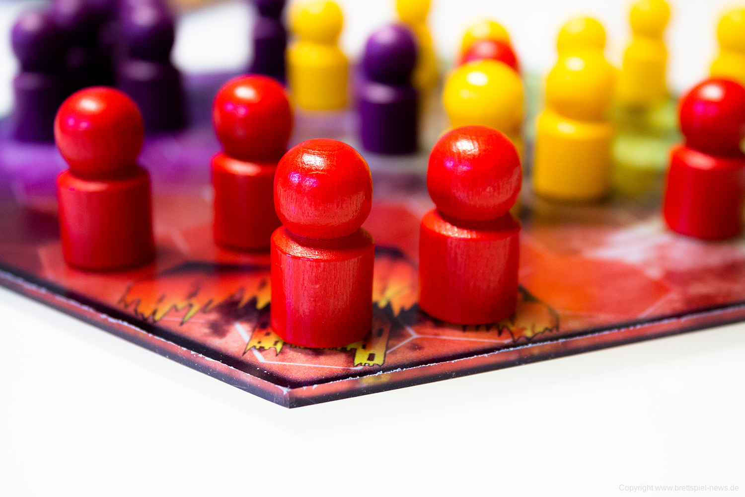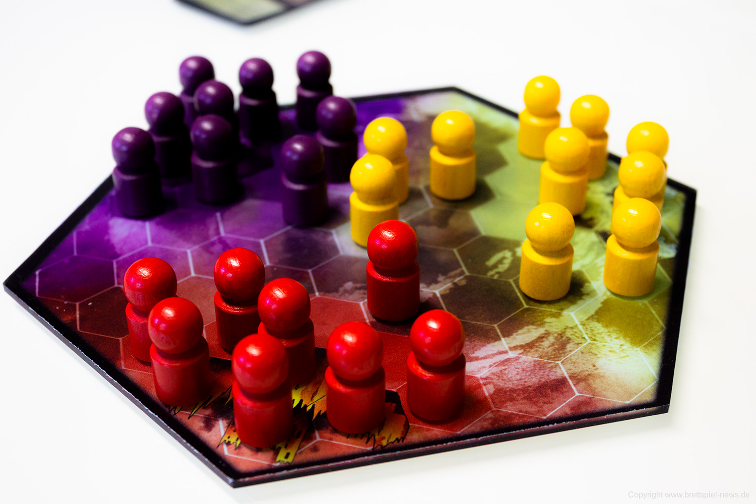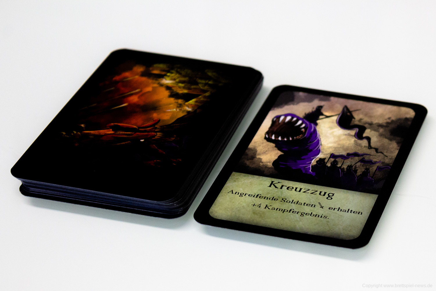 Tatsächlich bringt die kleine schwarze Schachtel mit dem Branding reichlich viel Innovation mit. Es funktioniert tatsächlich gut, zu dritt zu spielen und die Einheiten der Fraktionen branden auf dem Spielfeld aufeinander, um sich zu bekämpfen. Die Kämpfe sind durchaus spannend, gerade am Anfang, lässt sich die Stärke des Kontrahenten nur schwer einschätzen. Zusätzlich bringen vor allem die Aktionskarten starke Momente ins Spiel.