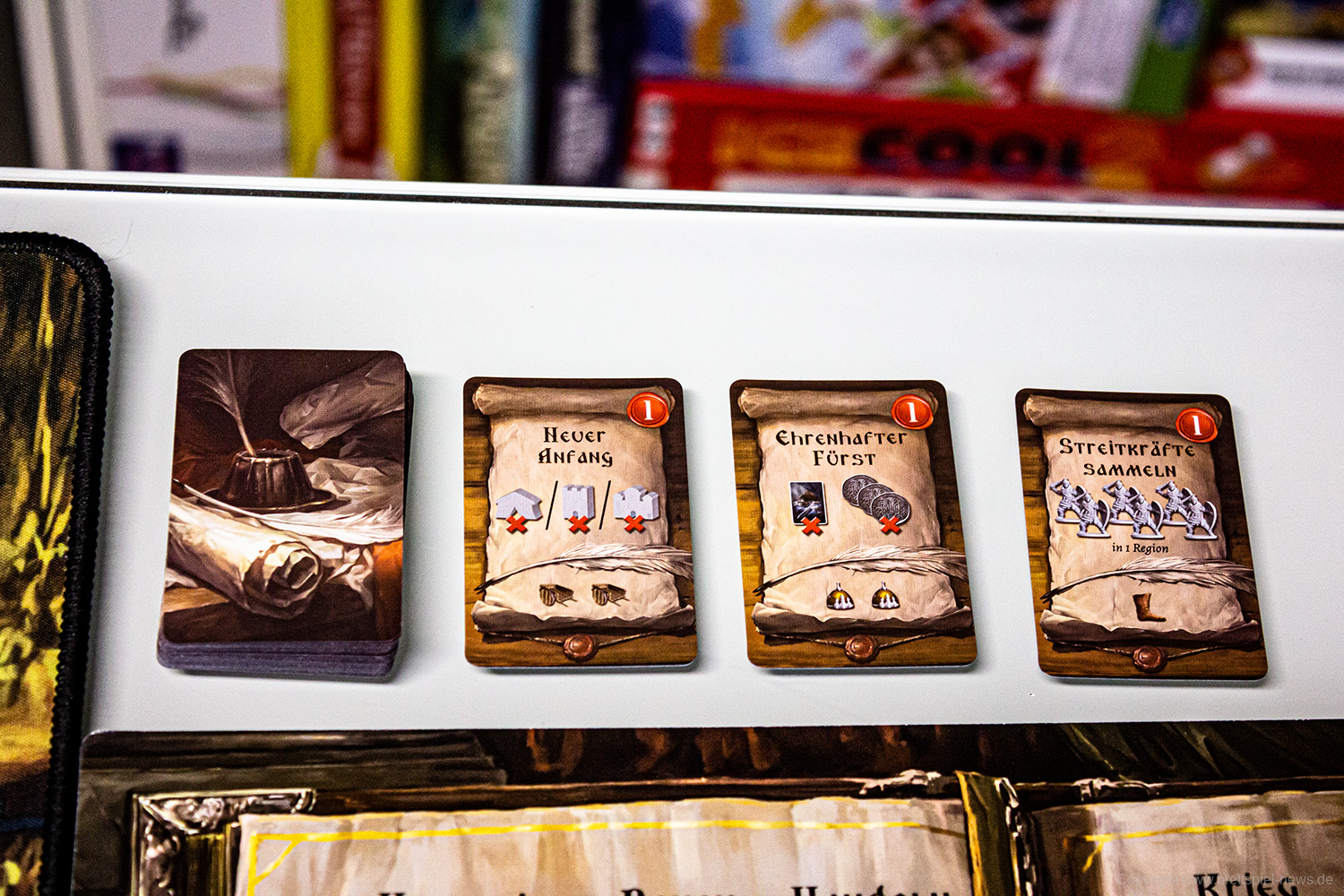 Ebenfalls gefallen haben mir die Kämpfe, denn wer angreift vernichtet immer eine gegnerische Einheit, läuft aber auch Gefahr, eigene Einheiten dabei einzubüßen. Durch das Erkunden des Intrigendecks, kann das Risiko aber etwas eingedämmt werden.