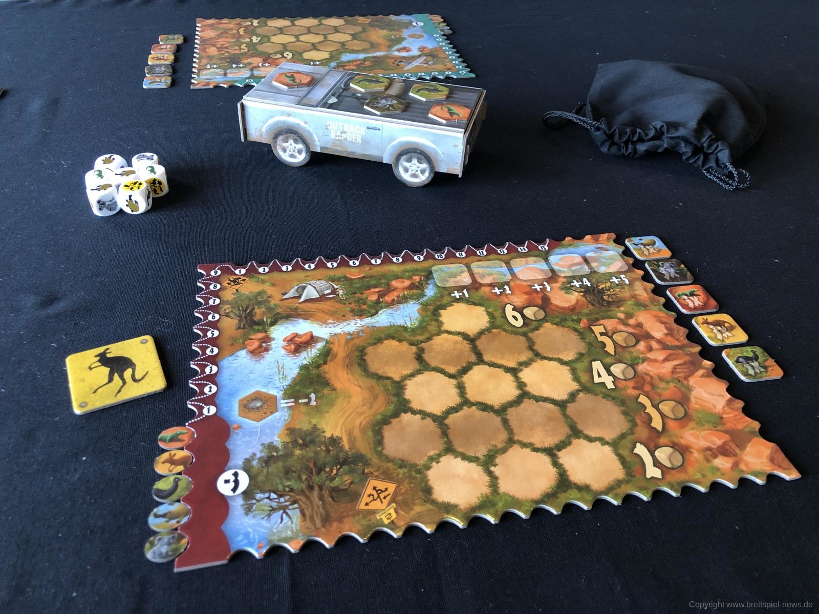 Das Spielmaterial ist, bis auf einen Kritikpunkt, sehr gut. Feste, stabile Tableaus, ein 3-D Jeep aus Pappe, der Stoffbeutel und die Qualität der Plättchen überzeugen. Lediglich die winzigen Punkteplättchen verrutschen gerne mal aus den Punkteleisten. Diese Tokens sind sehr minimalistisch ausgefallen.