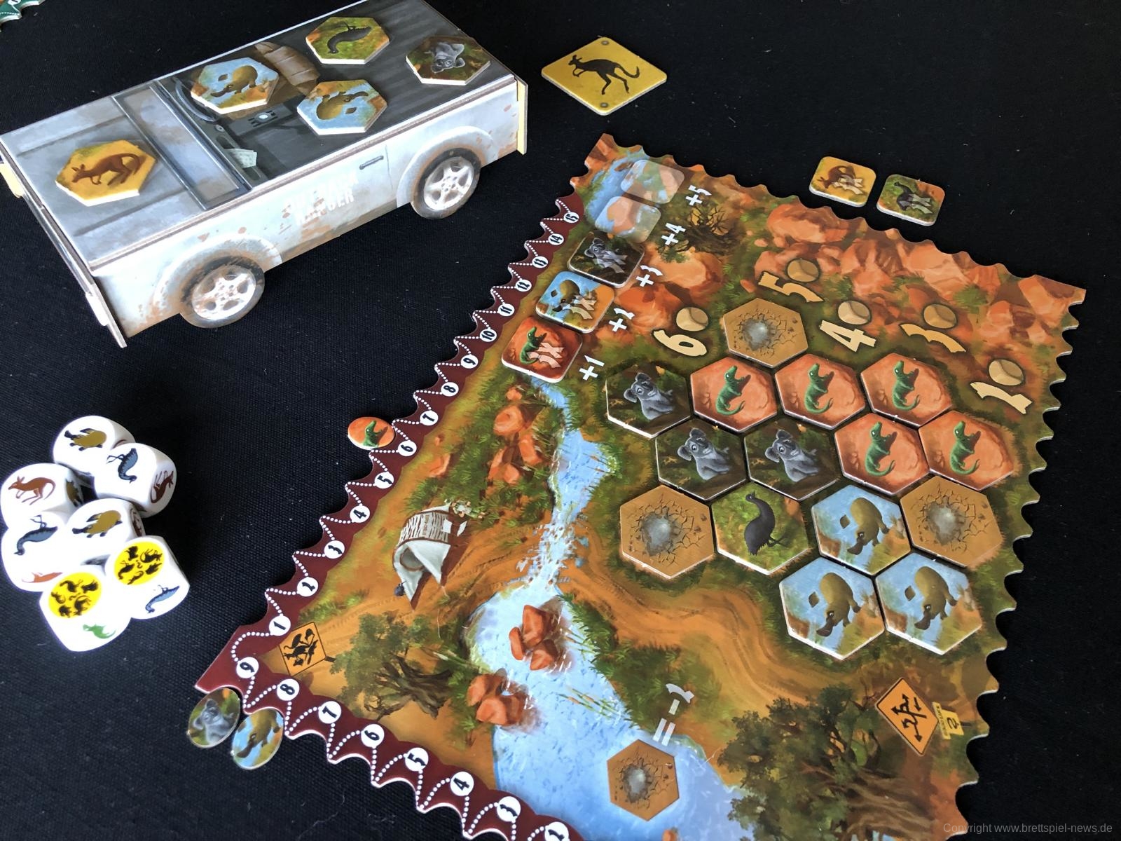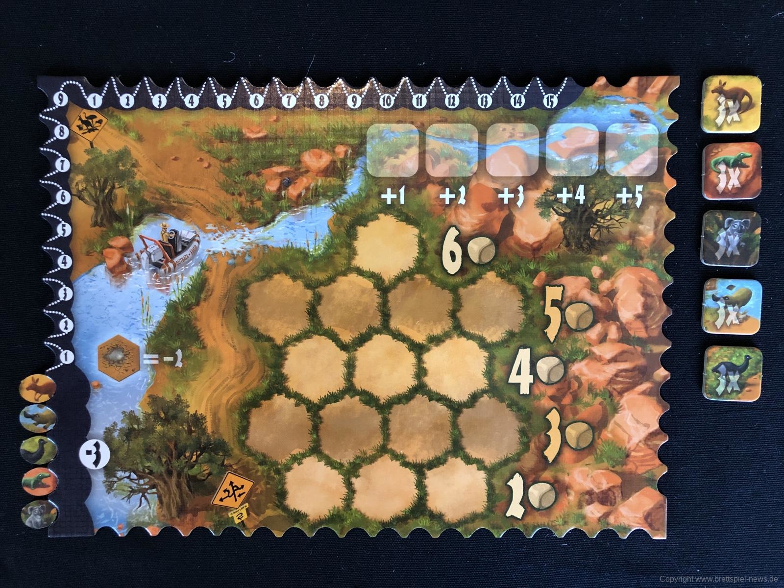 Für das Platzieren des Tieres im Outback gibt es einen Punkt, weitere Punkte erhalten die SpielerInnen für jedes Tier gleicher Art. Dabei zählt die komplette Tiergruppe, unabhängig davon, ob die Tierplättchen an das neu ausgelegte Tier angrenzen – evtl. ist nur ein gleiches Tier angrenzend, wobei die bereits liegende Tiergruppe aus 4 gleichen Plättchen besteht => 5 Punkte! Der Punktemarker dieser Tierart rückt weiter. Auf dem Tableau sind zwei Punkteleisten angebracht. Auf der linken Seite des Tableaus zählen am Spielende nur die drei letzten Punktemarker (hier gibt es einen Minuspunktebereich!). Schafft es ein Punktemarker auf die obere Leiste, sind diese Punkte am Spielende sicher und zählen immer. Das spezielle daran ist, dass die obere Leiste wieder mit niedriger Punktzahl startet. Es muss also gut überlegt sein, mit welchen Tieren ich punkten möchte.