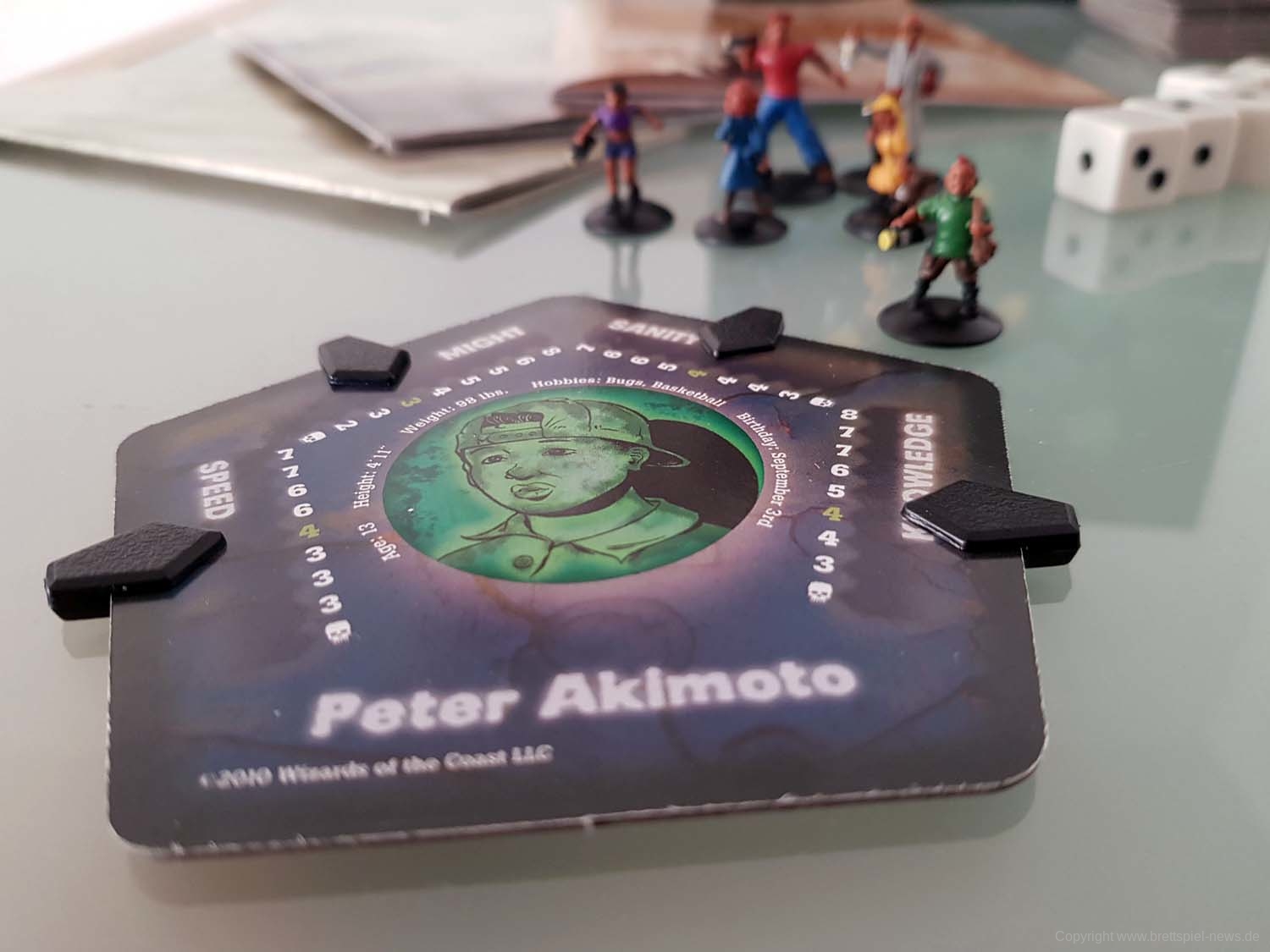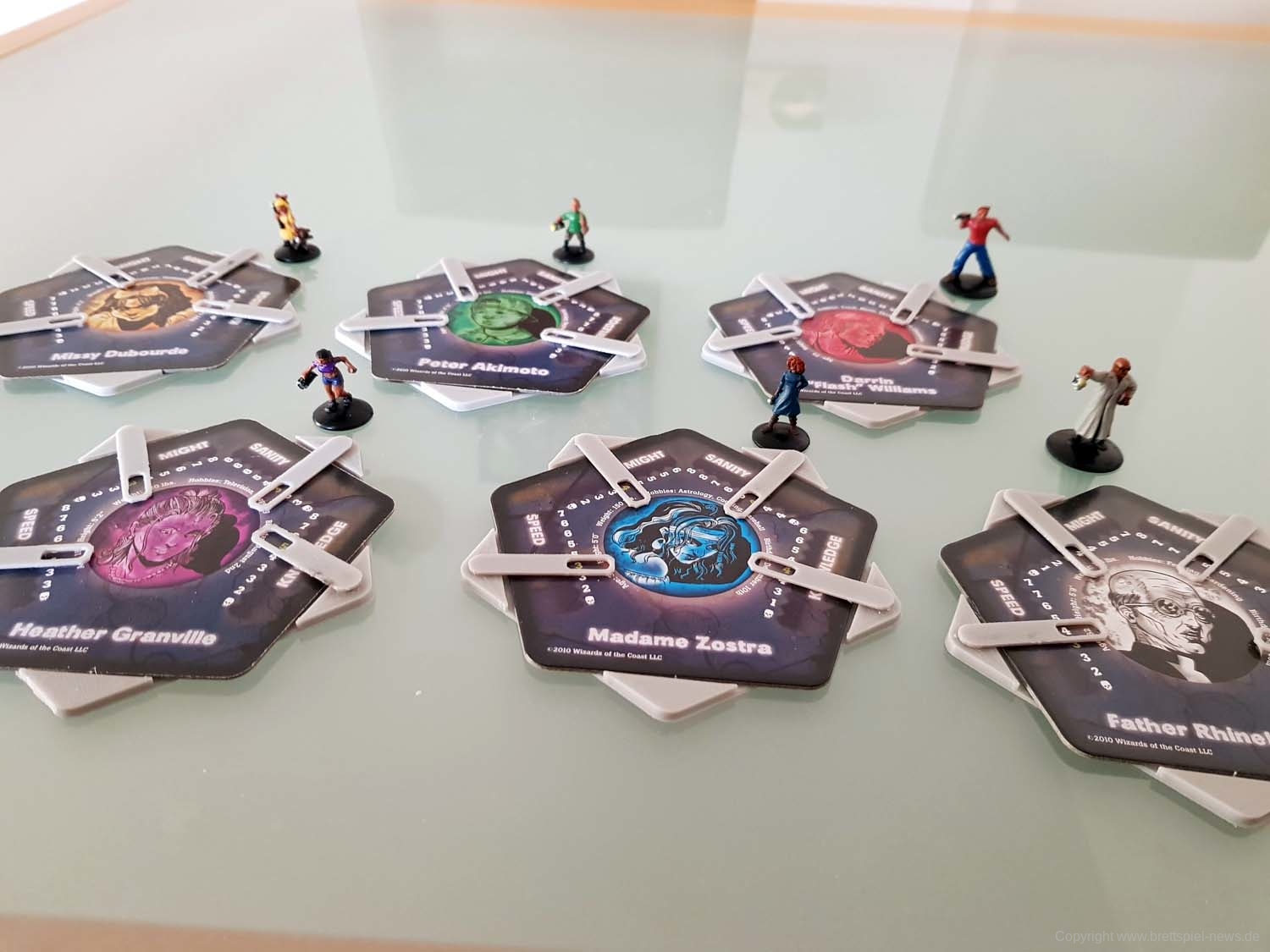 Zu Spielbeginn sucht sich jeder Spieler einen der vorgefertigten Charaktere aus. Diese unterscheiden sich über ihre Werte (Stärke, Geschwindigkeit, Wissen und geistige Gesundheit), dazu kommt jeder mit einer bemalten Miniatur daher. Der Mechanismus zur Auswahl des Startspielers ist clever: Auf jeder Charakterkarte ist neben Daten wie Hobbys oder Größe auch das Geburtsdatum des Charakters vermerkt. Wessen Charakter als nächstes Geburtstag hat, fängt an.