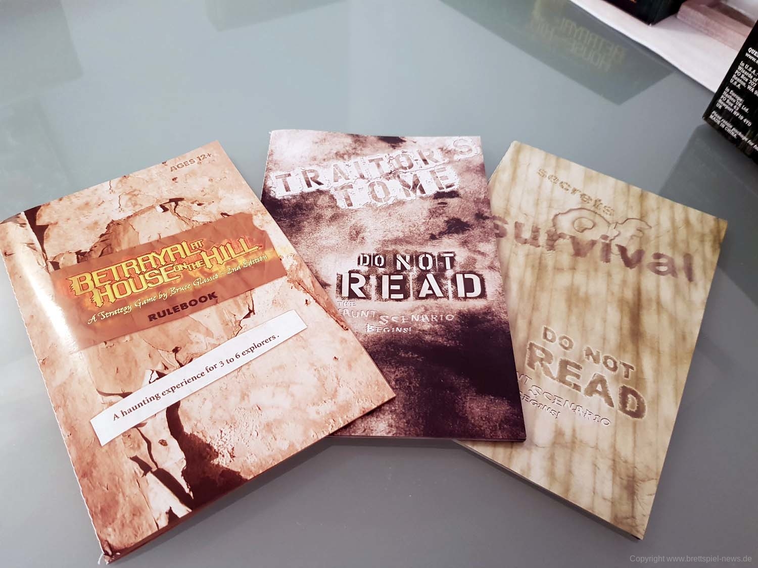 Nun schlägt man nämlich im „Buch der Verräter“ nach: Die Kombination des letzten Omens mit dem Raum, in dem es gefunden wurde, ergibt nämlich, welches Szenario nun gespielt wird. Und davon gibt es gleich 50 Stück, die sich sehr unterschiedlich spielen. Einmal öffnet sich ein Schlund zur Hölle und alle Spieler müssen versuchen, so schnell wie möglich das Haus zu verlassen. Ein anderes Mal wird ein Spieler von einem mörderischen Geist besessen und versucht nun, den anderen Spielern an den Kragen zu gehen. Zusätzliche Spannung kommt auf, weil ein Spieler - oft der, der den Plottwist („Haunt“) ausgelöst hat - und die restlichen Spieler unterschiedliche Informationen bekommen: Der eine liest (geheim, in einem anderen Zimmer) im „Buch der Verräter“, während der Rest gemeinsam das gleiche Szenario im „Buch der Überlebenden“ nachschlägt. Dabei wird den Spielern nicht immer alles genau verraten, aber man weiß nachher, was man erreichen möchte und welche Möglichkeiten einem dafür zur Verfügung stehen. Die Siegbedingungen variieren dabei von Seite zu Seite und von Szenario zu Szenario. Mit 50 verschiedenen Szenarien, die sich oft für beide Seiten sehr unterschiedlich spielen, ist also mehr als genug Wiederspielwert vorhanden.