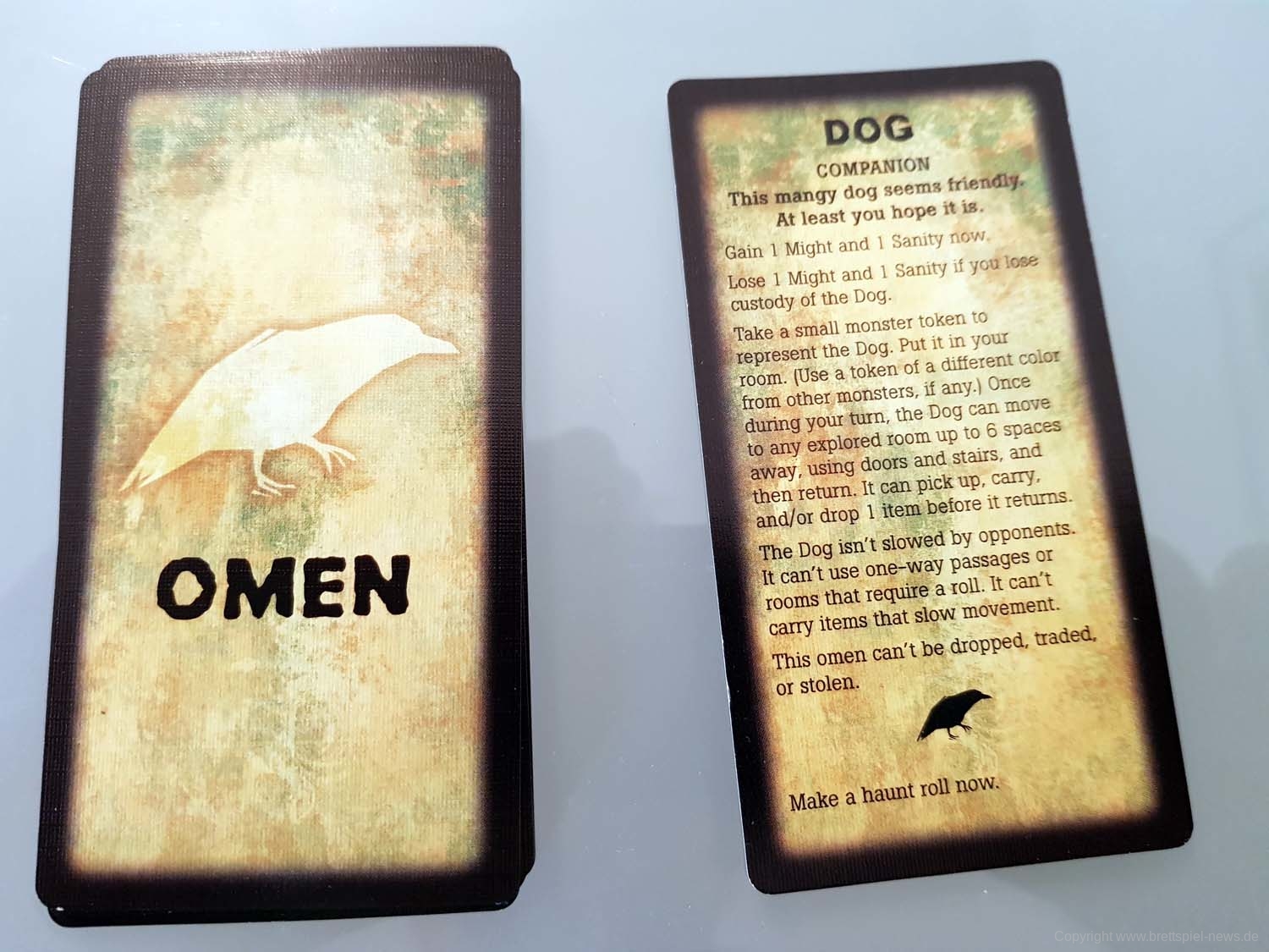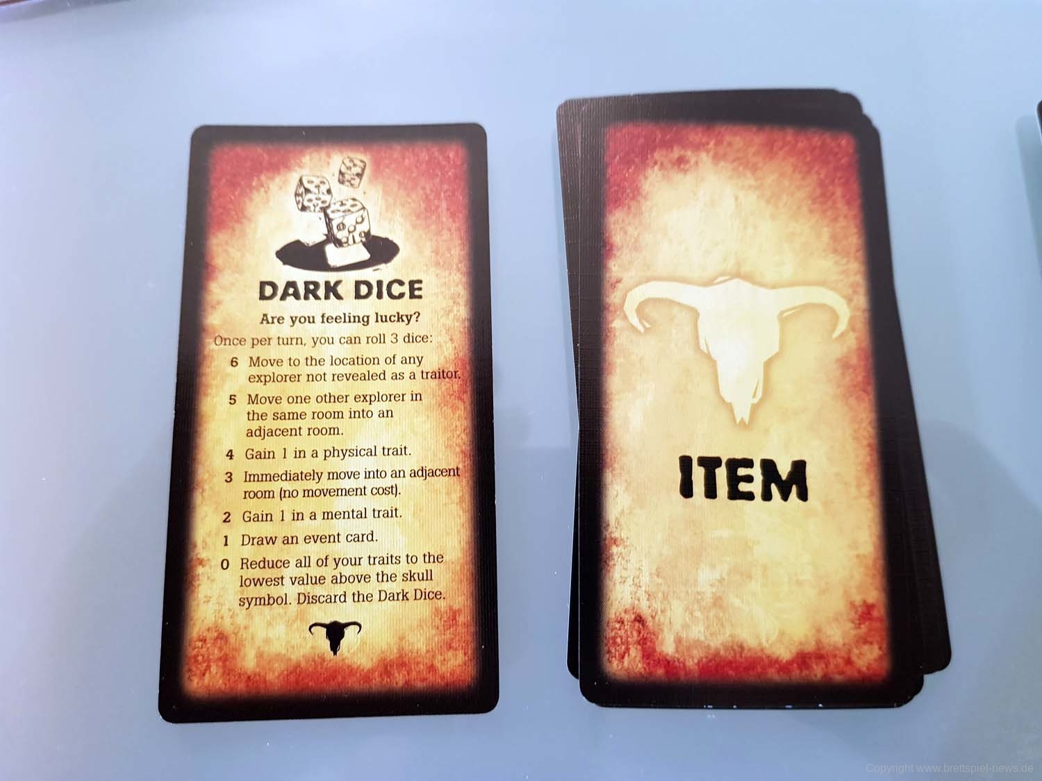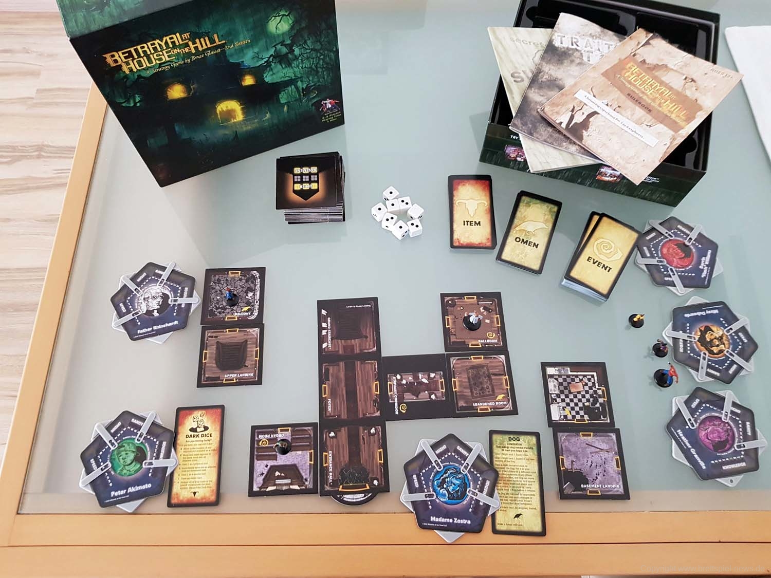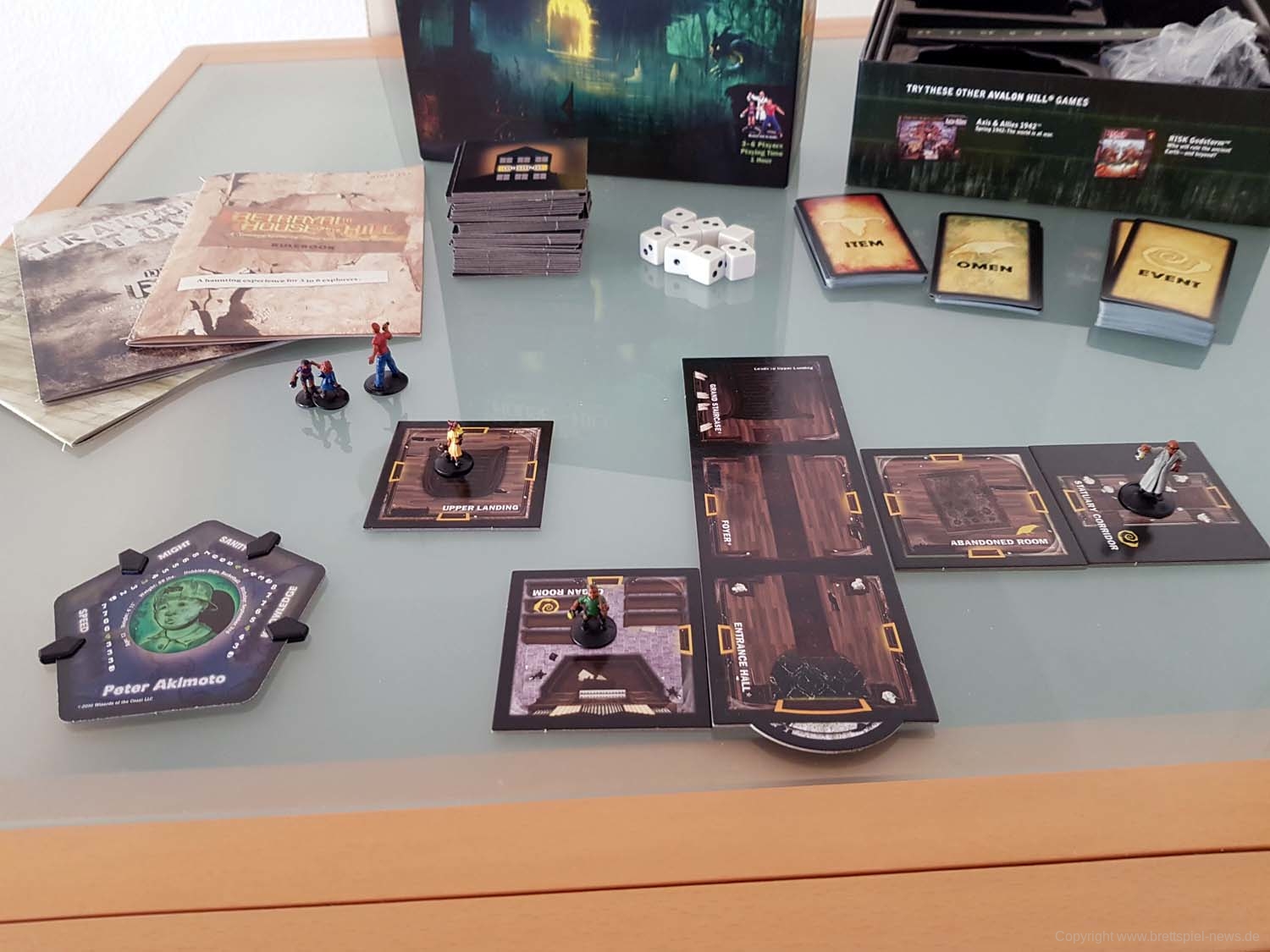 BETRAYAL AT HOUSE ON THE HILL hat in dieser Kategorie einige Stärken, aber auch ganz klare Schwächen. Die fünfeckigen Charakterkarten passen hervorragend zum Setting, die Plastikklammern zum Festhalten der Charakterwerte sind in meiner Version von Avalon Hill leider kaum zu gebrauchen. Sie verrutschen bei der kleinsten Erschütterung. Es gibt dazu aber zwei Lösungen: Man kann die Werte einfach mit Stift und Papier festhalten.Wer Zugriff auf einen 3D-Drucker hat, kann sich auch passende Halter ausdrucken. Macht mehr her, will man aber den Charakter auf der Rückseite nutzen, muss man die Halterung komplett entfernen. Beides sind aber deutlich bessere Lösungen als die furchtbaren Plastikklammern meiner Version. Ansonsten ist das Material solide: Die Raumplatten sind aus festem Karton, die Würfel (mit Werten von 0 bis 2) zwar schlicht, aber dafür gut lesbar. Gut gefallen mir die Gegenstand-, Omen-, und Ereigniskarten, die etwas schmaler und hochformatiger als klassische Spielkarten daherkommen und an Tarotkarten erinnern. Sehr stimmig und trägt zur unheimlichen Atmosphäre der Texte bei.