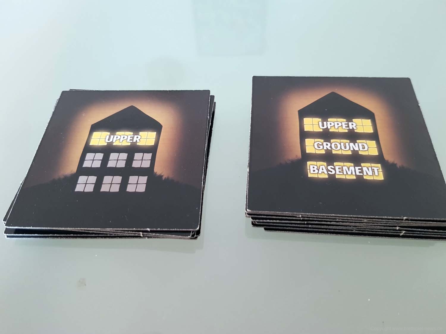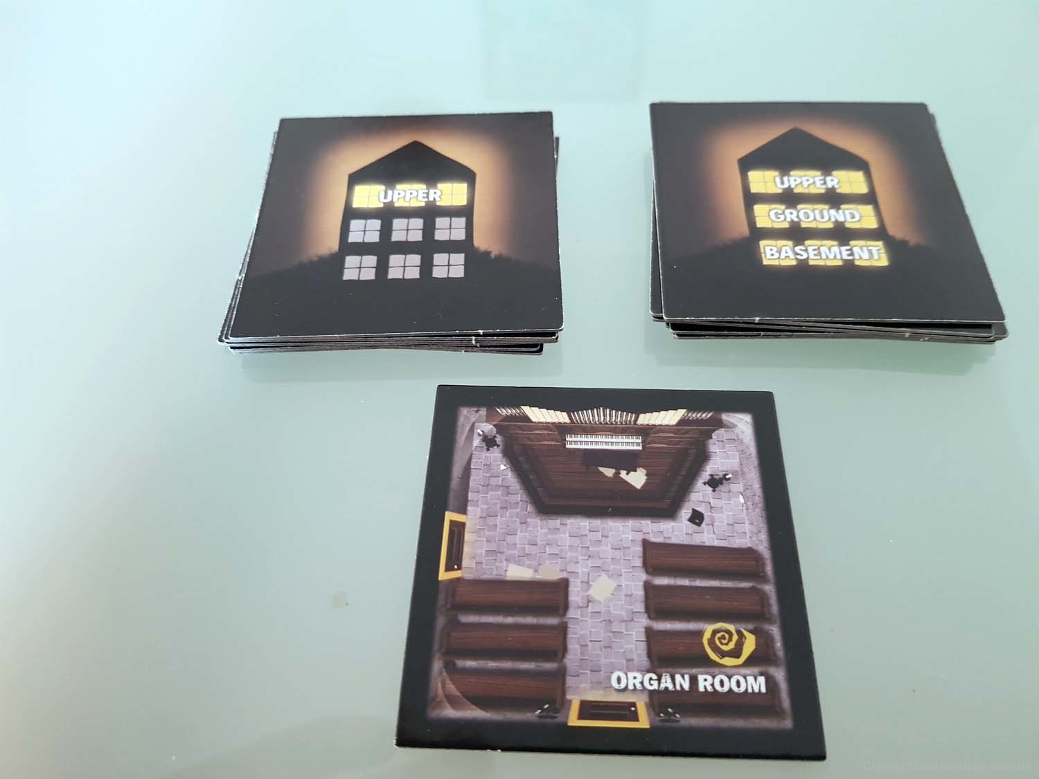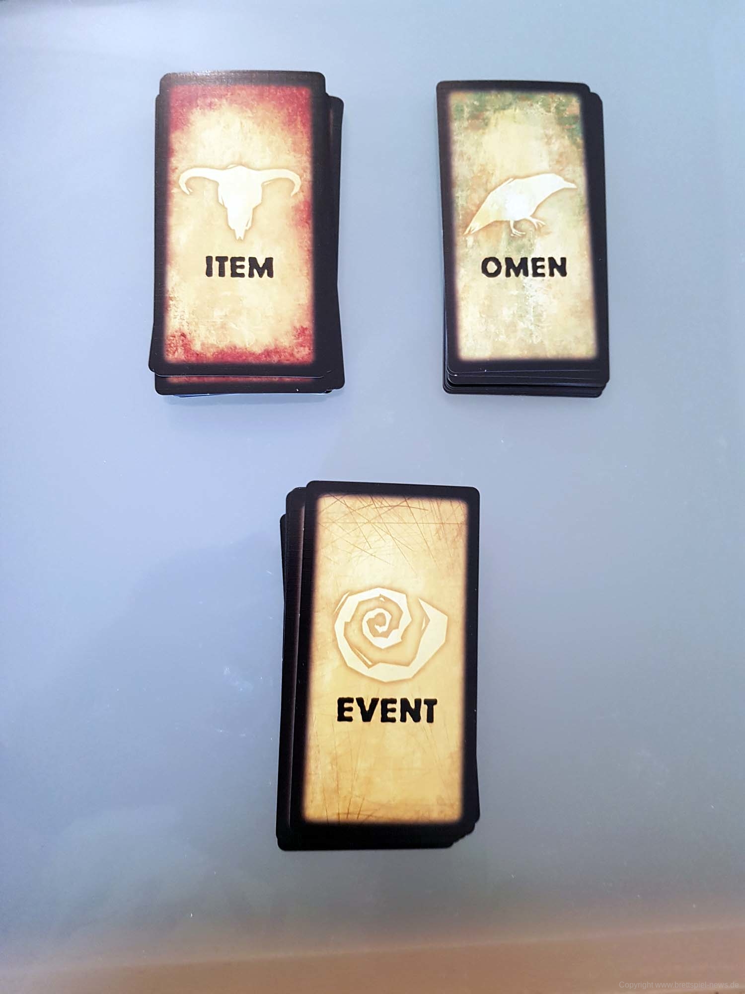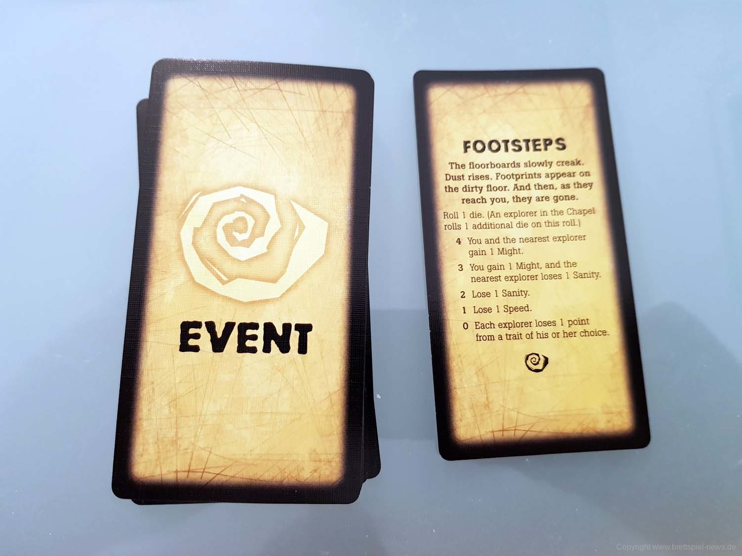 BETRAYAL AT HOUSE ON THE HILL hat in dieser Kategorie einige Stärken, aber auch ganz klare Schwächen. Die fünfeckigen Charakterkarten passen hervorragend zum Setting, die Plastikklammern zum Festhalten der Charakterwerte sind in meiner Version von Avalon Hill leider kaum zu gebrauchen. Sie verrutschen bei der kleinsten Erschütterung. Es gibt dazu aber zwei Lösungen: Man kann die Werte einfach mit Stift und Papier festhalten.Wer Zugriff auf einen 3D-Drucker hat, kann sich auch passende Halter ausdrucken. Macht mehr her, will man aber den Charakter auf der Rückseite nutzen, muss man die Halterung komplett entfernen. Beides sind aber deutlich bessere Lösungen als die furchtbaren Plastikklammern meiner Version. Ansonsten ist das Material solide: Die Raumplatten sind aus festem Karton, die Würfel (mit Werten von 0 bis 2) zwar schlicht, aber dafür gut lesbar. Gut gefallen mir die Gegenstand-, Omen-, und Ereigniskarten, die etwas schmaler und hochformatiger als klassische Spielkarten daherkommen und an Tarotkarten erinnern. Sehr stimmig und trägt zur unheimlichen Atmosphäre der Texte bei.