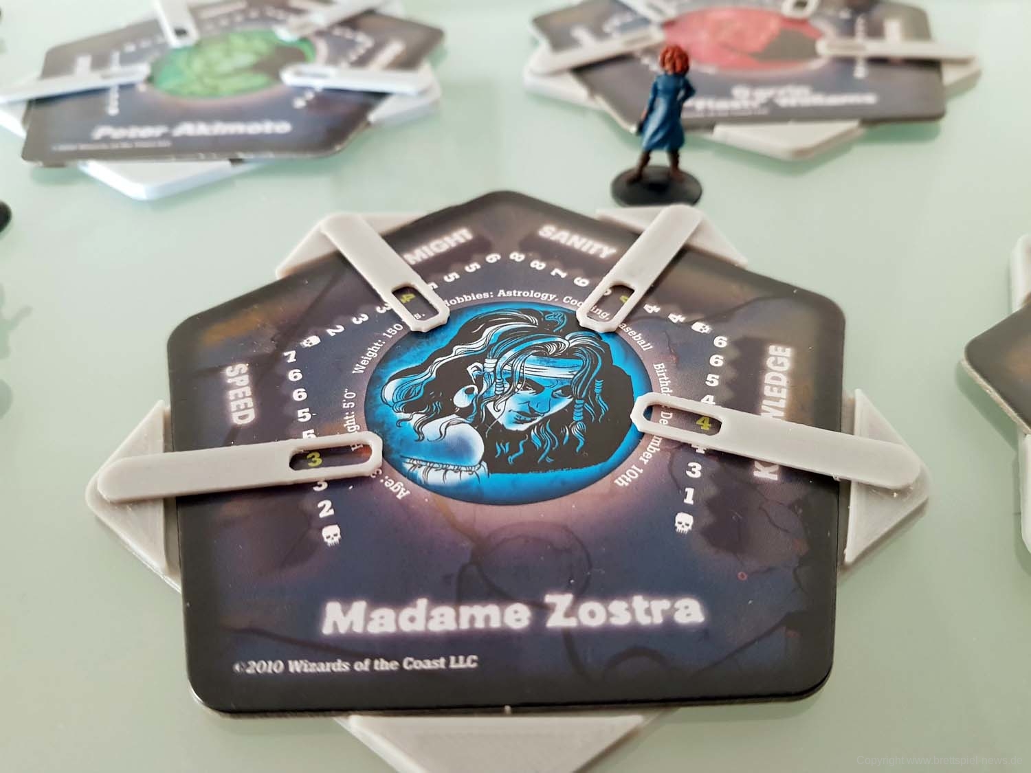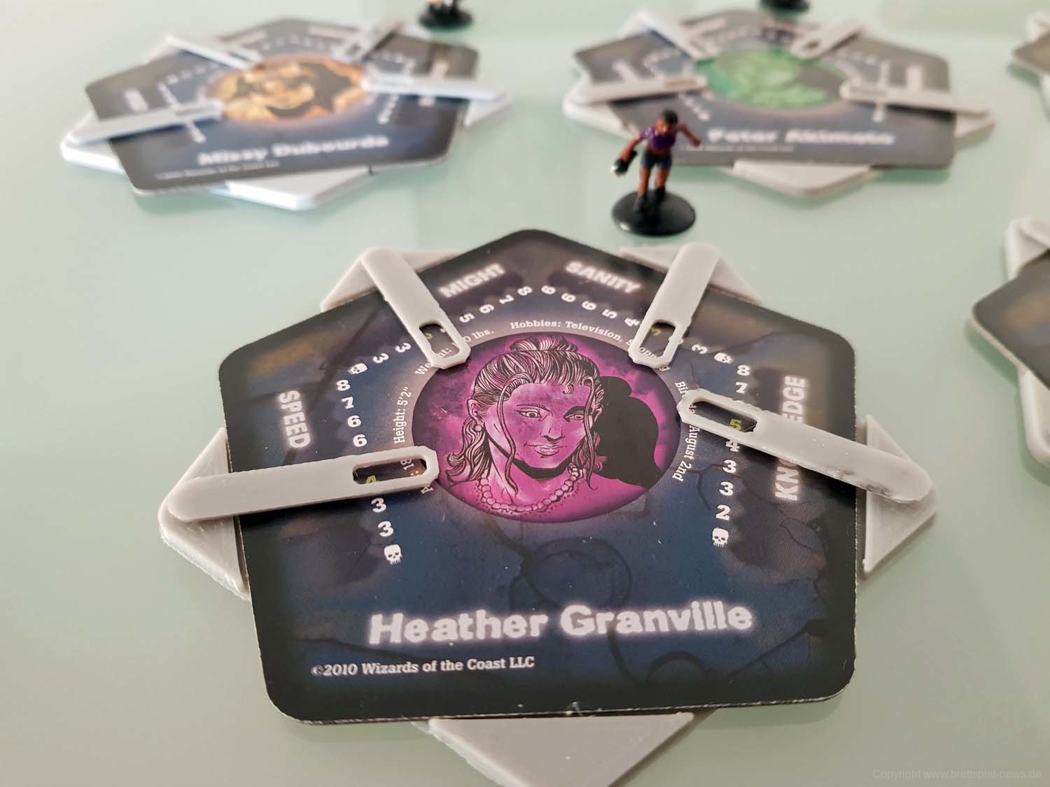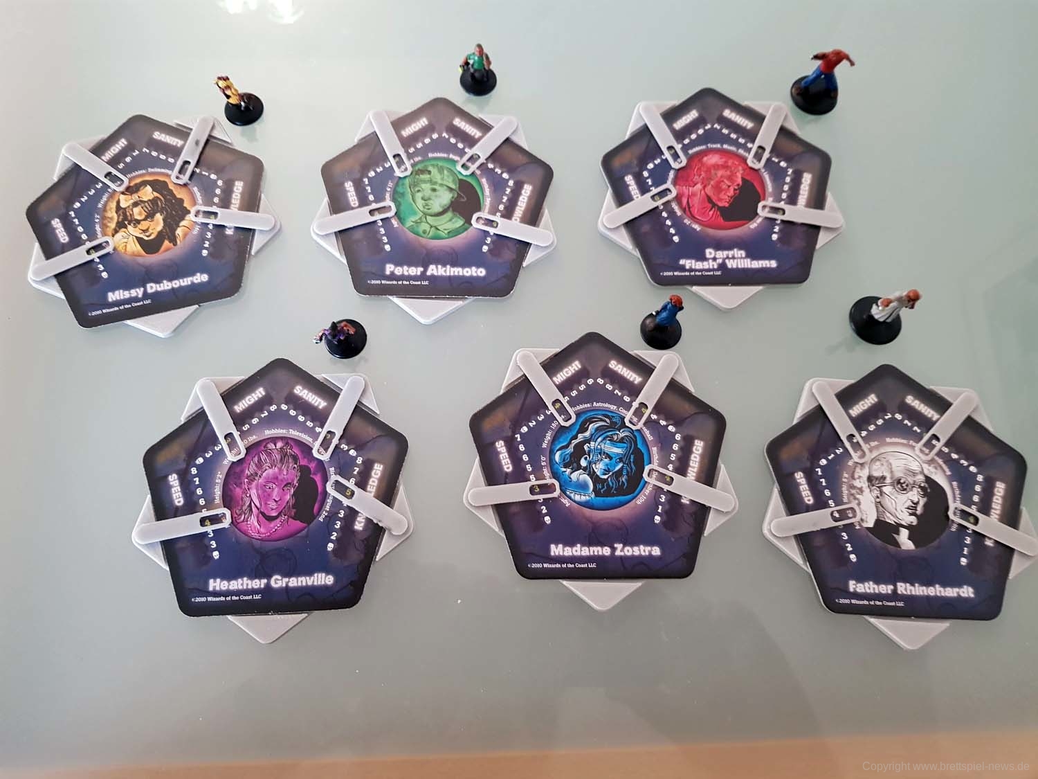 Zu Spielbeginn sucht sich jeder Spieler einen der vorgefertigten Charaktere aus. Diese unterscheiden sich über ihre Werte (Stärke, Geschwindigkeit, Wissen und geistige Gesundheit), dazu kommt jeder mit einer bemalten Miniatur daher. Der Mechanismus zur Auswahl des Startspielers ist clever: Auf jeder Charakterkarte ist neben Daten wie Hobbys oder Größe auch das Geburtsdatum des Charakters vermerkt. Wessen Charakter als nächstes Geburtstag hat, fängt an.