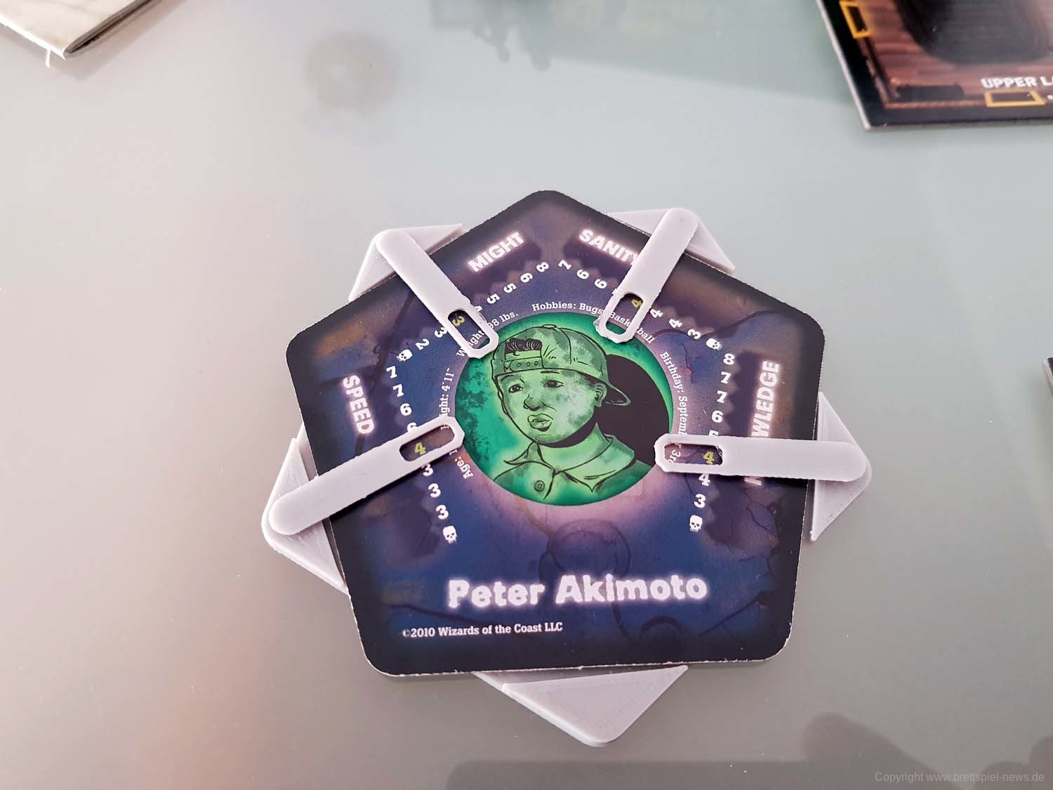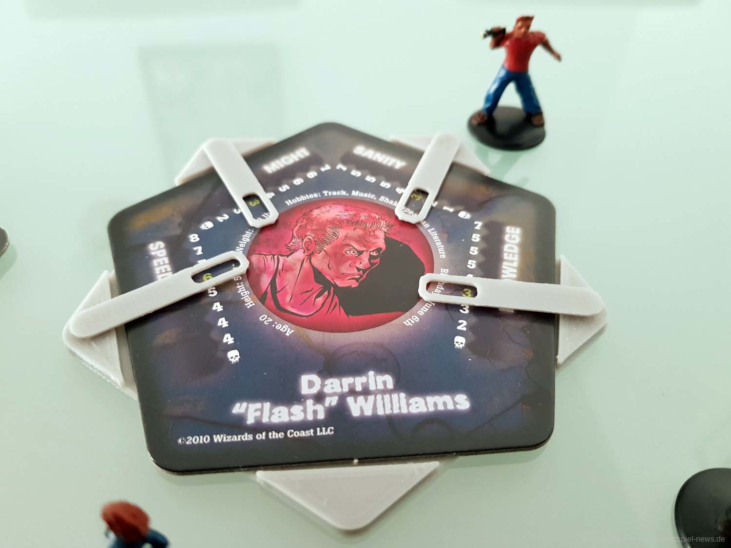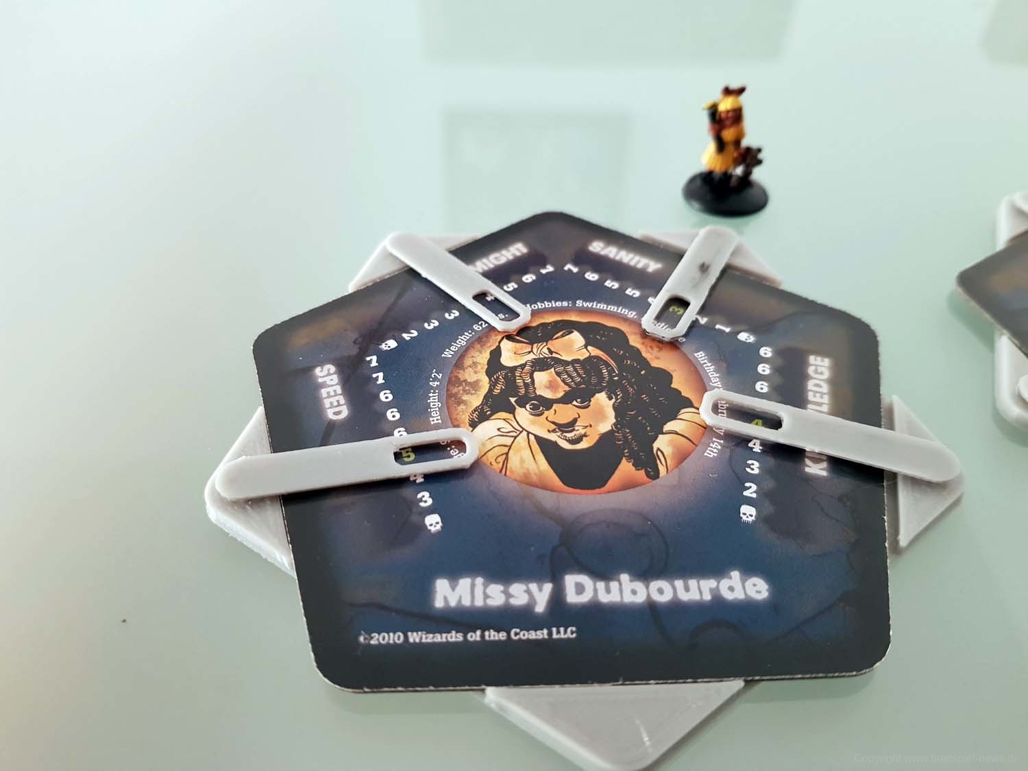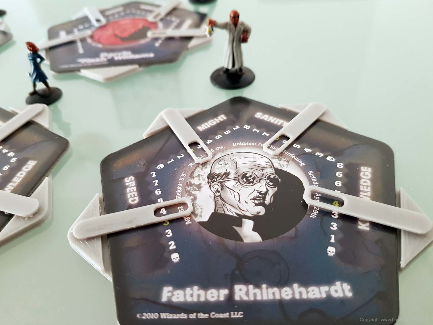 Zu Spielbeginn sucht sich jeder Spieler einen der vorgefertigten Charaktere aus. Diese unterscheiden sich über ihre Werte (Stärke, Geschwindigkeit, Wissen und geistige Gesundheit), dazu kommt jeder mit einer bemalten Miniatur daher. Der Mechanismus zur Auswahl des Startspielers ist clever: Auf jeder Charakterkarte ist neben Daten wie Hobbys oder Größe auch das Geburtsdatum des Charakters vermerkt. Wessen Charakter als nächstes Geburtstag hat, fängt an.