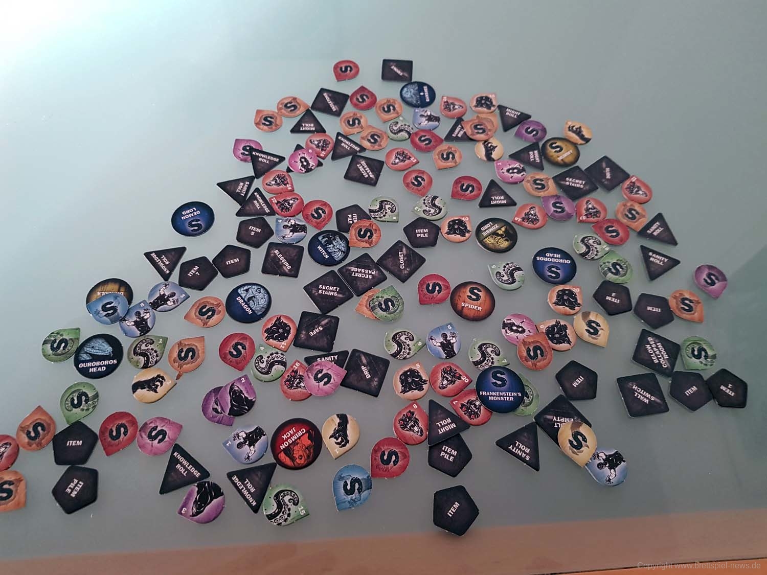 Einziger Wermutstropfen für mich ist das Spielmaterial. Die furchtbaren Plastikklammern meiner Avalon Hill-Version sind fast nicht zu gebrauchen. Dazu kommt die Unzahl verschiedener Token, die schwer auseinanderzuhalten sind. Hier hätte deutlich mehr Sorgfalt beim Design nicht geschadet. Ach ja: Das Spiel ist sehr textlastig, sowohl auf den Raumplatten, den verschiedenen Karten als auch in den Büchern (meine Version ist englisch).