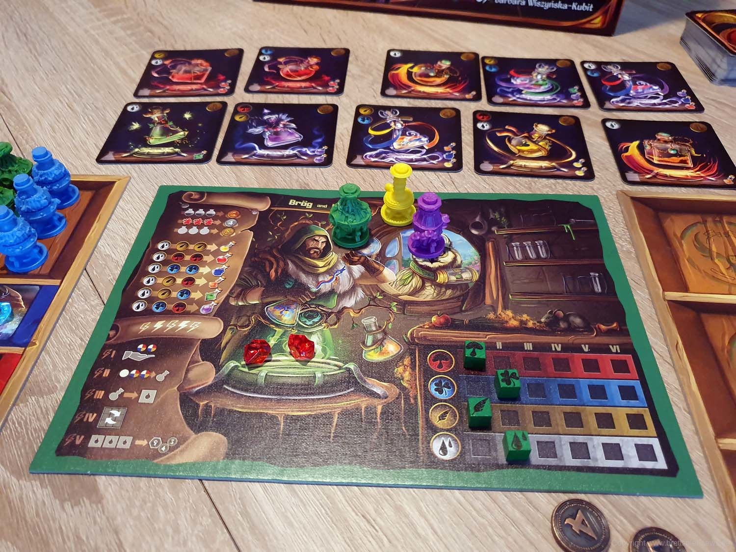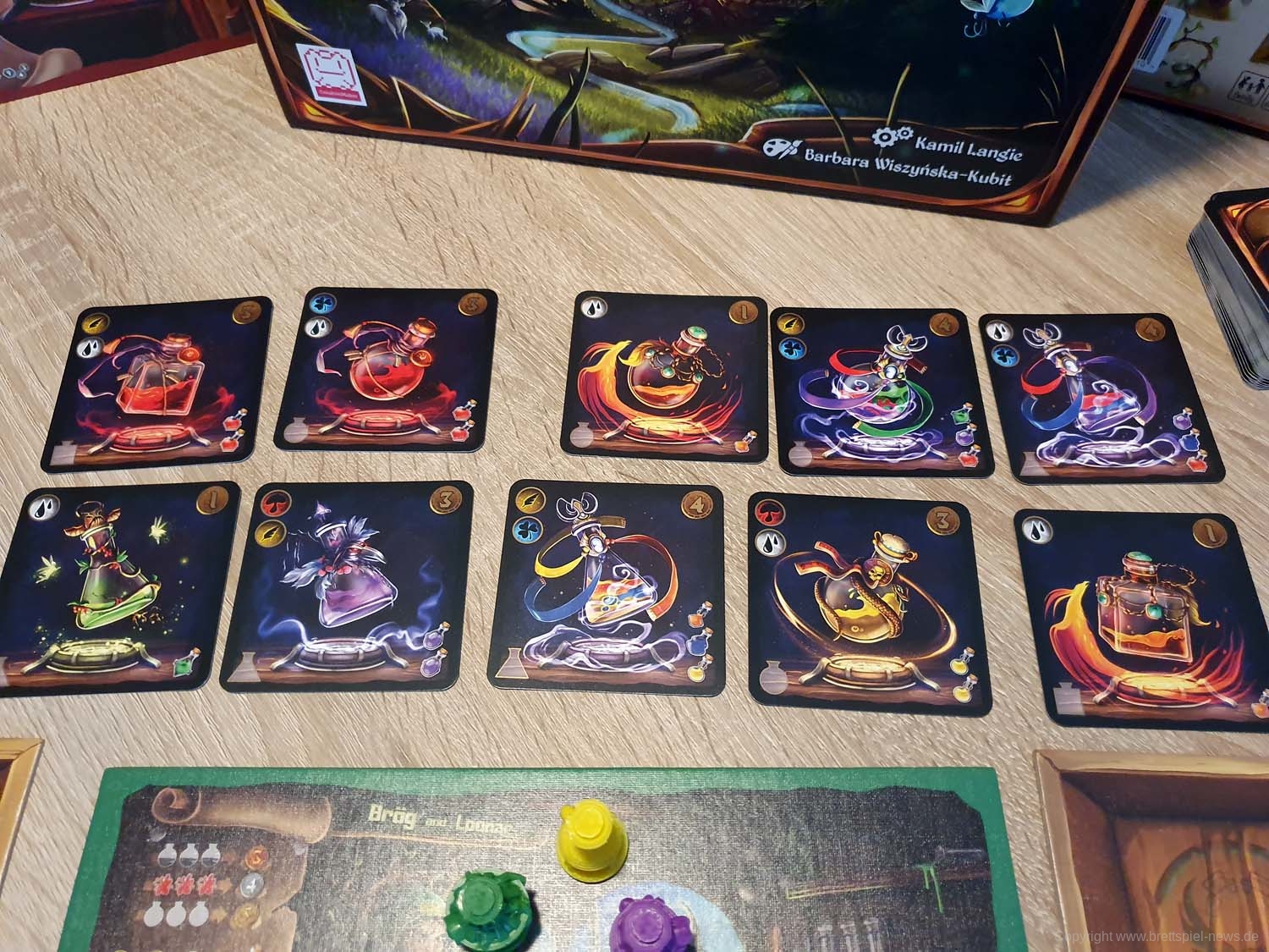 Das Artwork von Barbara Wiszynska-Kubit ist sehr farbenfroh und besticht mit schönen Charakterzeichnungen und variationsreichen Trank- und Eventkarten. Ein schönes Detail bei den Trankkarten ist außerdem, dass die wichtigsten Merkmale, wie die Kosten, die Form oder die Punkte für die Schlusswertung, mit einem Goldeffekt hervorgehoben werden. Die Box an sich überzeugt mit satten Farben und einer hohen Qualität.