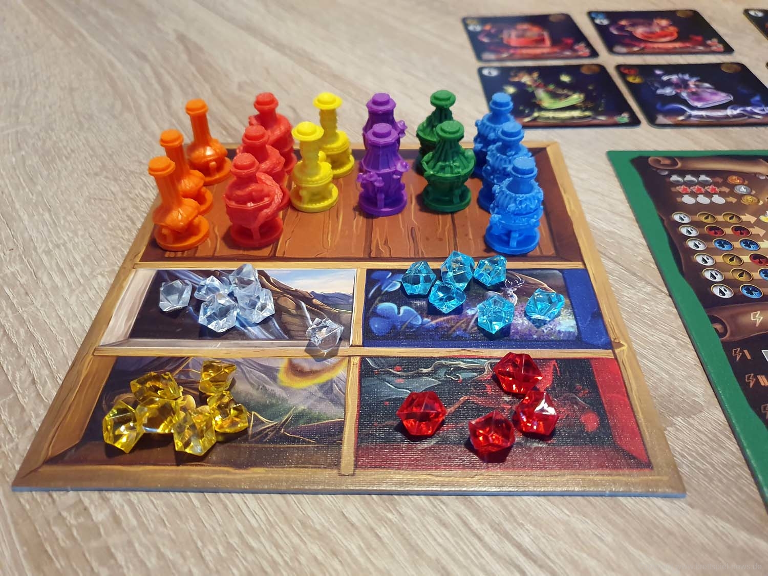 Die getestete Version enthielt 96 Zutatenmarker, die mit kleinen farbigen Acrylkristallen dargestellt werden. 50 Erfahrungspunktmünzen aus Pappe (bei der Kickstarter-Version aus Metall), 24 Sonderaktionsmarker (6 Pro Spieler), 4 Charakterkarten in 4 Farben (5 bei der Kickstarterversion), 4 Truhenkarten, 4 Ressourcenbretter, 84 Trankkarten, 18 Eventkarten und zu guter letzt 16 Spielermarker in den jeweiligen Spielerfarben.