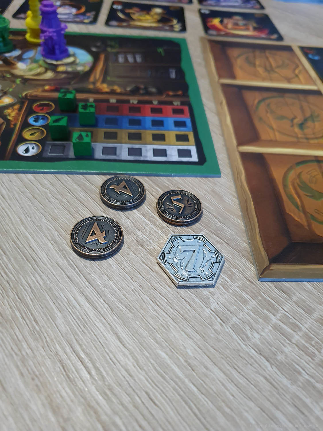 Aber es ist nicht nur Honig im Trank. Die Entscheidung der Entwickler, Erfahrungspunktmünzen mit komischen Werten (3,4,5 – 7,8,9 - 12) der Box zu beizulegen, erzeugt besonders bei der Endauszählung ein komplizierteres Erlebnis als nötig wäre. Die Inkludierung einer Einser- und Zweiermünze hätte dies um einiges flüssiger gemacht.