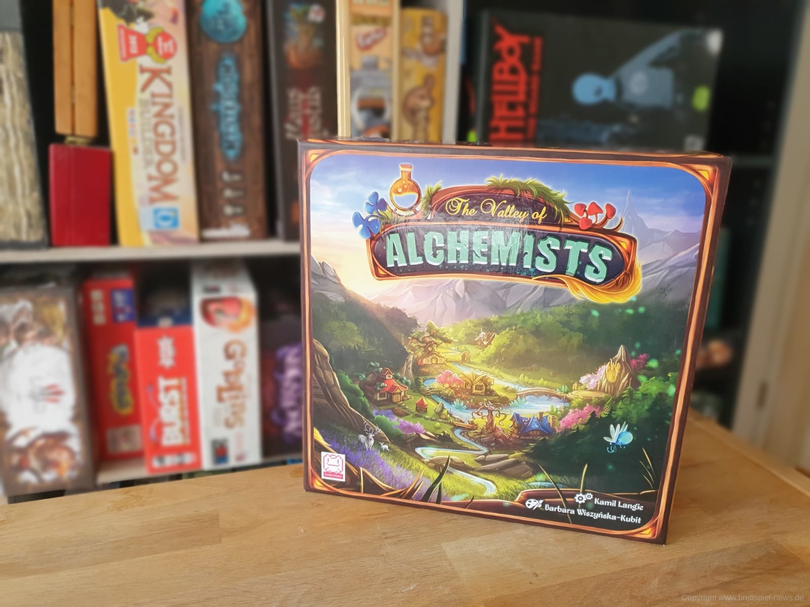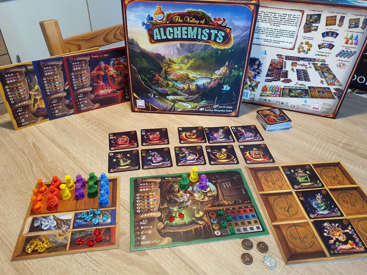 Um herauszufinden, ob dieses Rennen um den Titel „Bester Alchemist aller Zeiten“ etwas taugt, liegt uns zum Test eine private „The Valley of Alchemists“-Kopie vor, die es nun erstmal genauer zu begutachten gilt. Hinweis: Bei der getesteten Version handelt es sich um die Kickstarter-Variante. Es ist somit möglich, dass sich die Qualität des Spielmaterials und der Inhalt bei einer möglichen Verlagsveröffentlichung von dieser Variante unterscheidet!