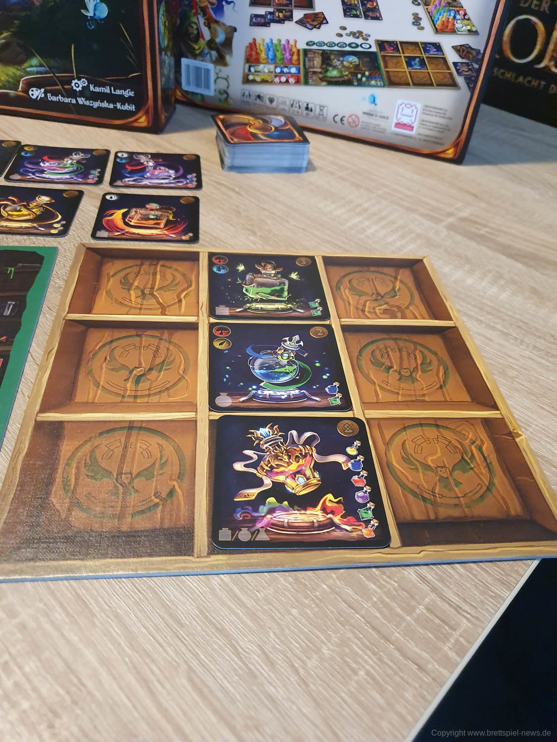 Das Artwork von Barbara Wiszynska-Kubit ist sehr farbenfroh und besticht mit schönen Charakterzeichnungen und variationsreichen Trank- und Eventkarten. Ein schönes Detail bei den Trankkarten ist außerdem, dass die wichtigsten Merkmale, wie die Kosten, die Form oder die Punkte für die Schlusswertung, mit einem Goldeffekt hervorgehoben werden. Die Box an sich überzeugt mit satten Farben und einer hohen Qualität.