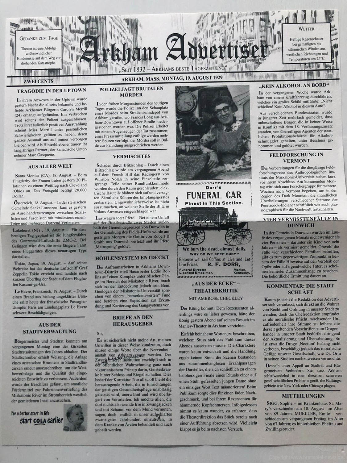 Mythos Tales schickt euch nach Arkham, Massachusetts, in dessen düsteren Winkeln und dunklen Gassen sich grauenvolle und mysteriöse Dinge ereignen. Noch scheint die Stadt einen friedvollen Eindruck auf euch zu machen, doch der Schein trügt. Seid auf der Hut, eure Anwesenheit wurde bereits bemerkt. Seid ihr bereit, euch den großen Alten entgegenzustellen? Könnt ihr die Geschehnisse aufklären oder endet ihr als weiterer vergessener Fall in der Geschichte der Stadt? Ich habe einen Blick für euch riskiert…