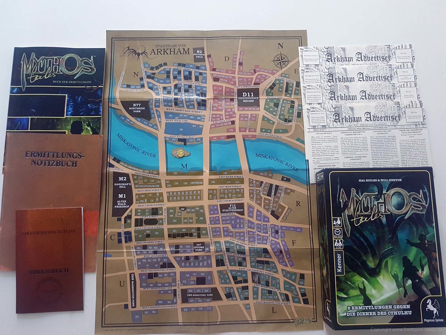 Das Spielmaterial von Mythos Tales ist meines Erachtens sehr gut gelungen. Es bietet ein schönes, gut strukturiertes Notizheft und ein dickes, mit verschiedenen Fällen gefülltes Buch der Ermittlungen, in dem viele handgemalte Bilder prangen. Für ein Spiel, das zwar mehr im Kopf, als auf dem Tisch stattfindet, ist der Preis mehr als angemessen, auch wenn ich mir den Spielplan der Stadt lieber aus Stoff oder Papier gewünscht hätte.