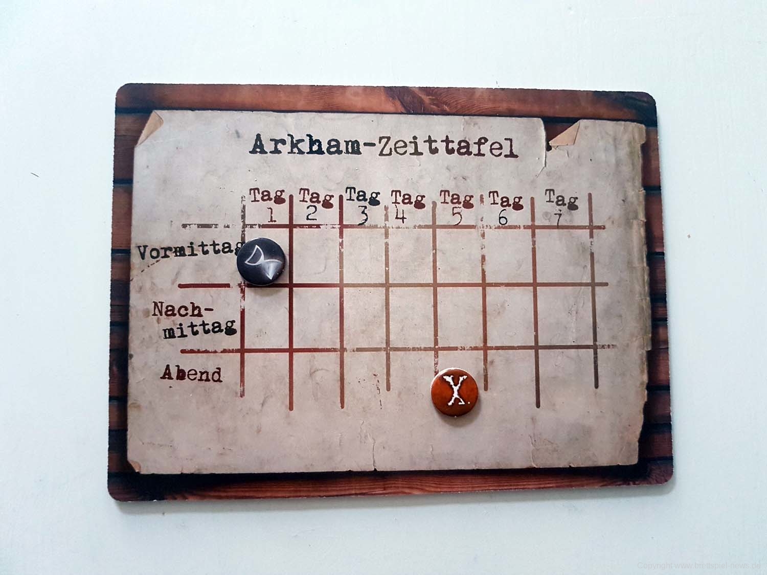 Der Spielaufbau ist simpel. Zunächst wird das Buch der Ermittlungen herausgenommen und die Anfangsbedingungen des jeweiligen Falls laut vorgelesen. Dann markiert ein Spieler auf der Zeittafel, bis wann der Fall spätestens abgeschlossen sein sollte. Jedes Mal, wenn ein neuer Ort bereist wird, schreitet der Marker auf der Zeittafel voran. Pro Tag können 3 verschiedene Orte aufgesucht werden, einer vormittags, einer nachmittags und einer abends. Bevor sich die Spieler nun Hals über Kopf in die Detektivarbeit stürzen, sollte jedoch die zu dem Fall passende, beigelegte Zeitung gelesen werden. Im Arkham Advertiser sind so manche Hinweise enthalten, die Armitage den Spielern nicht mitteilen wird. Nun wird der Spielplan mit der Karte der Stadt ausgelegt. Auf diesem können die Spieler sich frei bewegen, das bedeutet, es kann in jeder Runde des Spiels zu einer anderen Lokation gewechselt werden. Jeder Ort in Arkham ist mit einer bestimmten Nummer beschriftet, sodass jedes Gebäude im Adressbuch einer Person zugeordnet werden kann.