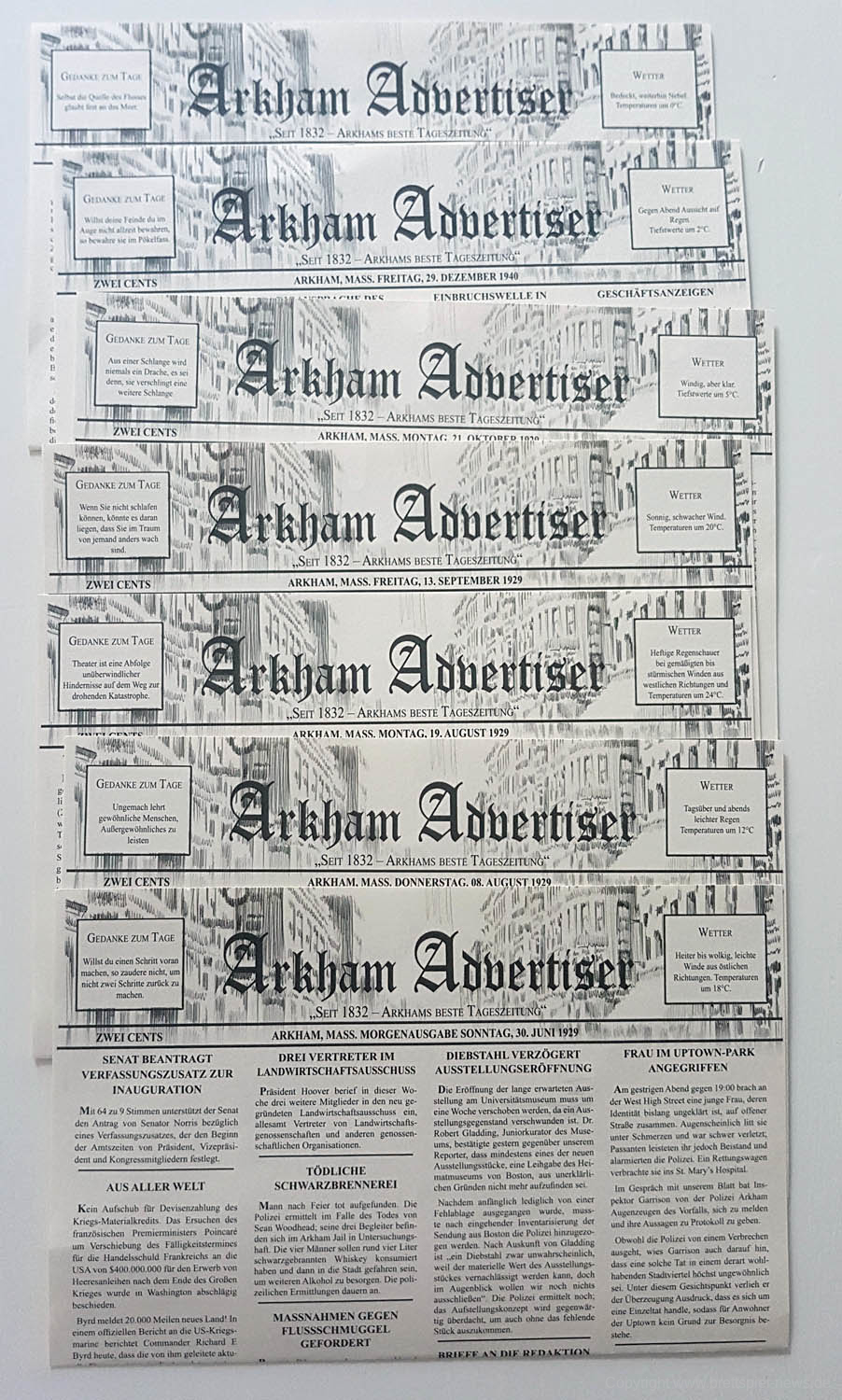 Zunächst erst mal bietet Mythos Tales für einen schmalen Taler 8 Fälle, in denen ich mich ausgiebig als Ermittler austoben konnte. Da ungefähr 2 Stunden für jeden Fall benötigt werden, bietet Mythos Tales eine Menge Spielzeit. Das Thema ist natürlich sehr an die von dem Buchautoren H.P Lovecraft erschaffene Welt angelehnt, in der die sogenannten „großen Alten“ erwachen. Dies sind Kreaturen, die Menschen in den Wahnsinn treiben, und deren Anhänger versuchen, die Welt zu unterjochen. Das Spiel bietet daher sowohl für Fans, als auch für Neueinsteiger viele schöne Erzählungen, die auf den Geschichten von H.P Lovecraft basieren. Ich war damals noch recht unbefangen von dem Thema, doch das Spiel weckte mein Interesse, wodurch ich anfing, mich mit Lovecraft auseinanderzusetzen und seine Bücher zu lesen. Das Spiel hat einen schönen Zeichenstil und es versetzt den Spieler in die wahrhaftige Rolle eines Detektivs. Der Schwierigkeitsgrad ist schön knackig, doch nie ungerecht und steigt immer weiter an, was auch daher rührt, dass die Geschichten aufeinander aufbauen und auch Hinweise aus vergangenen Fällen zusammengetragen werden sollten. Diese werden im letzten Teil von „Pasquales Wette“ gekrönt, bei der sich in unserer Version des Spiels jedoch der Fehlerteufel eingeschlichen hatte. Wir konnten den Fall nicht adäquat beenden, da der Bedingungsmarker nicht auffindbar war, der zum entscheidenden Schluss benötigt wurde. Auch nachdem wir das Buch der Ermittlungen komplett durchgegangen waren und uns alle Ereignisse angeschaut hatten, konnten wir keine Stelle finden, an der wir den Marker hätten bekommen sollen. Ebenfalls muss ich bemängeln, dass das Aufsuchen von Orten, die keinen Eintrag haben und dennoch den Marker der Zeitleiste voranschreiten lassen, einfach lästig ist und den Spielfluss stört. Alles in allem ist das Spiel, trotz seiner kleinen Fehler, sehr spaßig und unterhaltsam und bietet ein gutes Preis-Leistungs-Verhältnis. Eine klare Kaufempfehlung für Lovecraft Fans und alle, die es werden wollen.