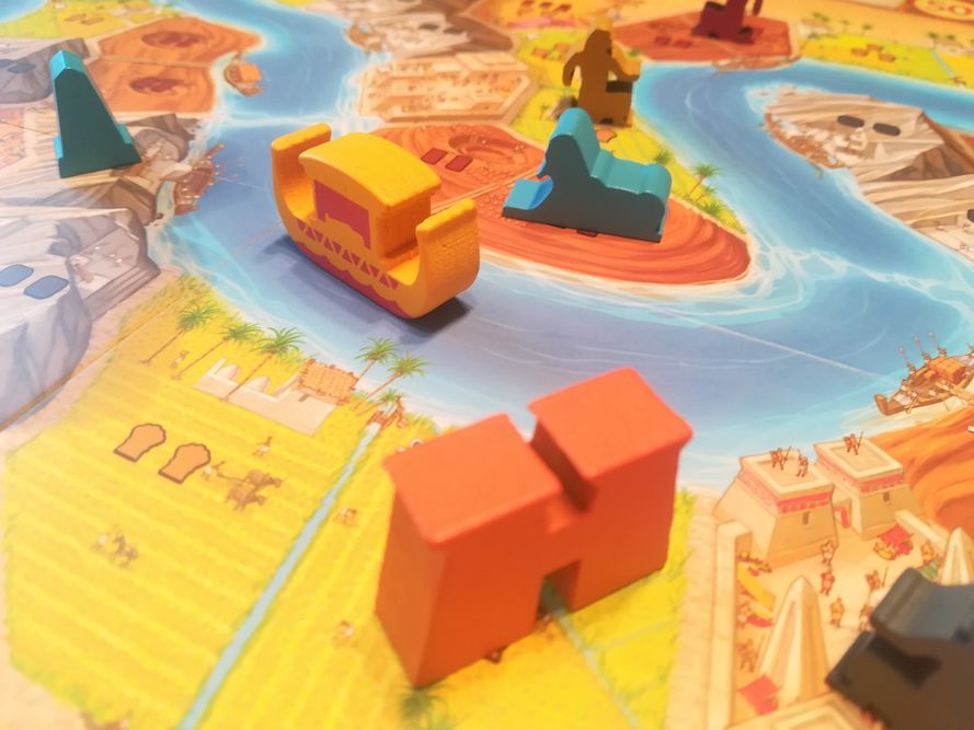 - Bauen die SpielerInnen ein Monument, wird dieses auf ein zu bebauendes Feld entlang des Nils gesetzt. Monumente geben den Hauptanteil an Rhumespunkte, die man generieren kann. Ein Feld, auf dem ein Monument steht, ist für den Rest des Spiels für weitere Aktionen gesperrt. Monumente können jederzeit überall entlang des Nils gebaut werden. Baut der Spieler das Monument in den Flussabschnitt, in dem sich die Barke befindet, erhält er einen extra Ruhmespunkt. Nur geplante und nicht gebaute Monumente werden am Ende einer Saison aus dem Spiel entfernt.