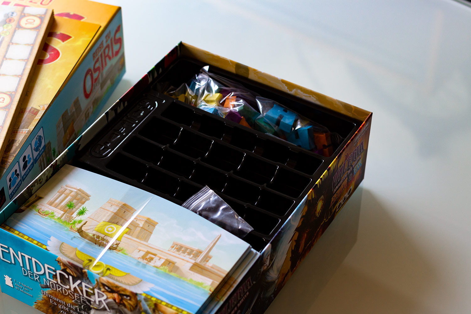 Warum ich im Erklärungsteil nicht darauf eingegangen bin, ist ganz einfach, weil dieser Aspekt des Spiels in all unseren Runden fast gar nicht zum Einsatz gekommen ist. Selbst wenn ich versucht habe, dies anzuzetteln, wurde ich eher blockiert, als dass jemand Lust gehabt hätte, mit mir zu handeln. Um herauszufinden, woran dies liegt – Gruppe oder Spiel –, müsste ich REISE ZU OSIRIS noch öfter und mit unterschiedlicheren MitspielerInnen spielen. Da mir Reise zu Osiris nur bedingt gefallen hat, wird es vermutlich bei den sechs Partien bleiben, die ich für diese Rezension gespielt habe. In einem Zwei- und Drei-Personen-Spiel setzt man neutrale Gebäude ein, um Felder zu blockieren. Dies führt dazu, dass es etwas unübersichtlich wird. Wir haben das in einer weiteren Partie einfach weggelassen, was für uns um einiges angenehmer war. Für Zwei- bis Drei-Spielerpartien würde ich REISE ZU OSIRIS nicht unbedingt empfehlen. Hier gibt es andere worker placement Spiele, die mehr hergeben.