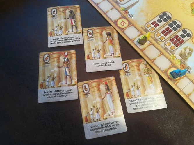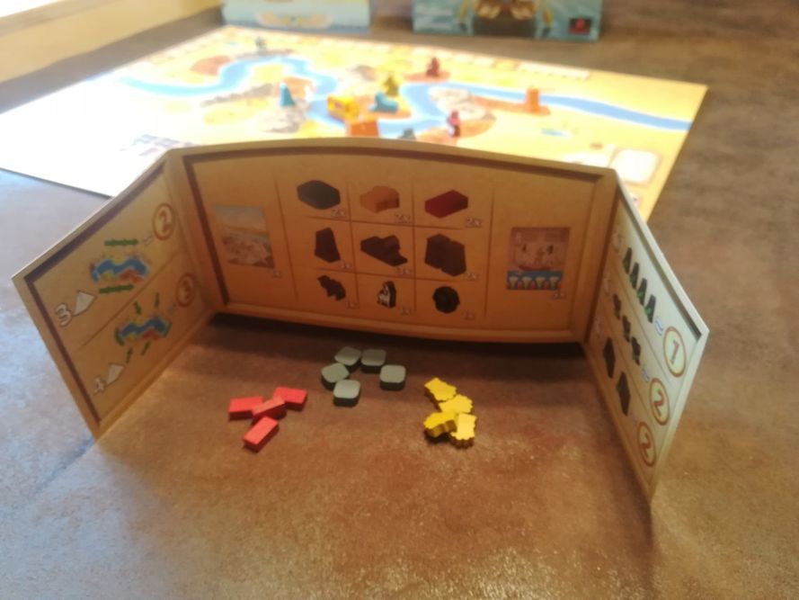 REISE ZU OSIRIS hat mir persönlich nur bedingt gefallen. Der Aspekt, dass die Ressourcen und Arbeiter begrenzt sind und geheim gehalten werden, ist eine interessante Mechanik. Leider machen einem die Sichtschirme hierbei öfter einmal einen Strich durch die Rechnung. Die Abbildung der Startressourcen auf dem Sichtschirm ist irgendwie sinnlos, da wäre eine Aktionsübersicht um einiges besser gewesen. Durch die zehn Aktionsmöglichkeiten, die zur Verfügung stehen, kann die Downtime doch relativ hoch werden. Das Spielmaterial gefällt mir besonders gut, dass Thema wirkt nicht aufgesetzt und ist gut eingebettet. Ein wichtiger Aspekt des Spiels ist der Handel unter den Spielern, es ist alles handelbar: von den Ressourcen über die Karten bis hin zu den Arbeitern.