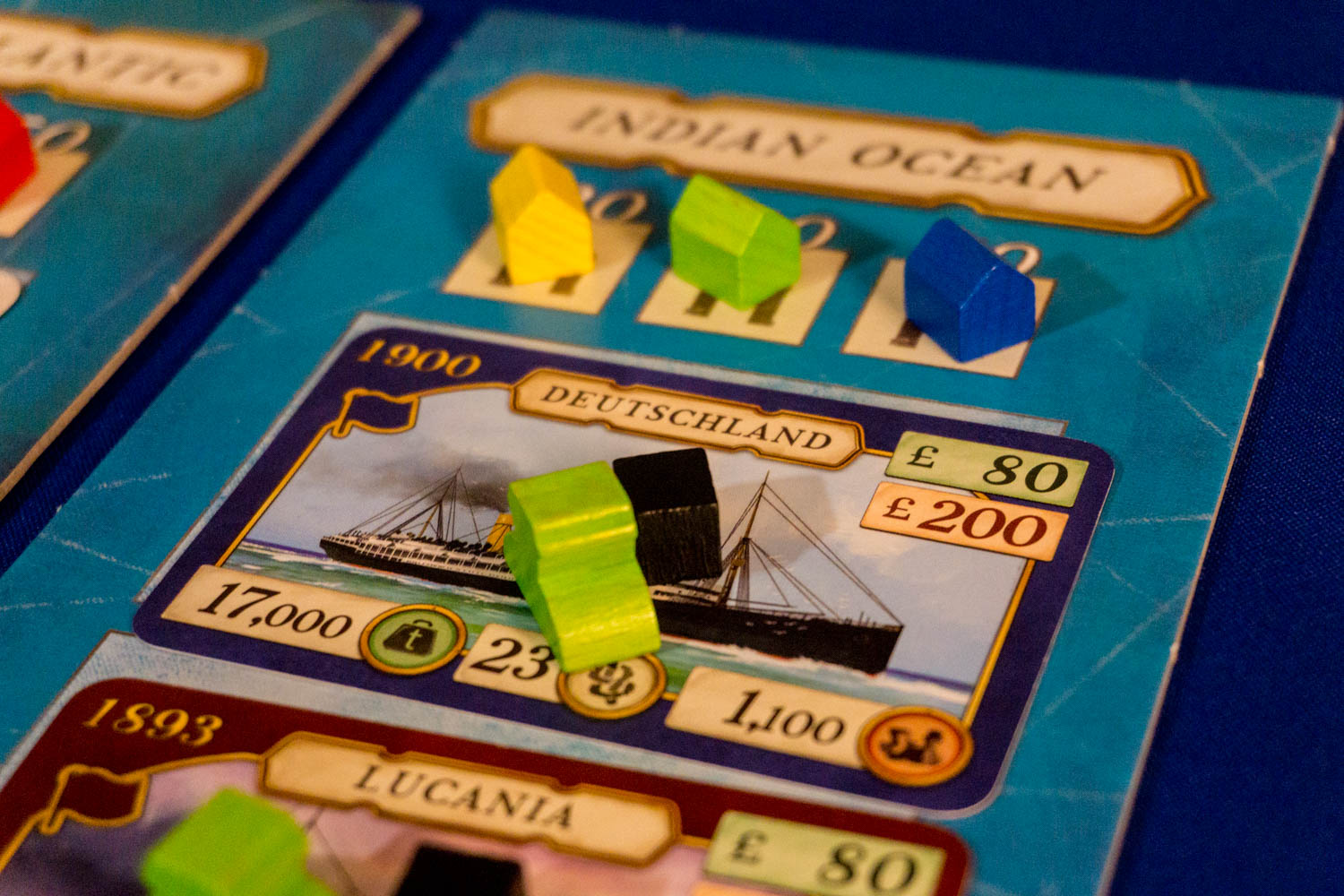 Die Box beinhaltet jede Menge Holzmarker, Karten und Pappteile. Die Schiffskarten sind unterschiedlich bedruckt und beruhen auf wahren historischen Begebenheiten. So besteht unter anderem auch die Möglichkeit, die Titanic zu erwerben. Die Kapitänsfiguren sowie die Kohlemarker sind als Holzmarker gefertigt und haptisch gut zu spielen. Der Spielplan ist stabil, aber leider langweilig designt. Neben all dem guten Material wurde außerdem wieder auf das altbewährte Papiergeld zurückgegriffen.