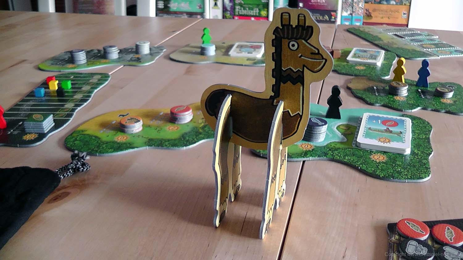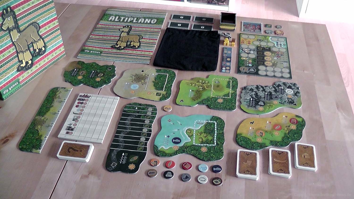 Die Box kommt in bunter Optik daher und ist prall gefüllt. Das Material ist sehr stabil und die zahlreichen Warenplättchen und Münzen sind von so guter Qualität, dass sie trotz ständigem Agieren mit ihnen noch keine Abnutzungserscheinungen aufweisen. Die Vorratskisten der einzelnen SpielerInnen lassen sich vor dem ersten Spielen einfach zusammenbauen. Nach dem Spiel finden sie zusammengebaut ihren Platz in der Box und halten gut zusammen. Nur der Startspielermarker (ein überdimensionales Alpaka) muss vor jedem Spiel zusammengesteckt werden und hält nach einigen Partien nicht mehr so gut wie am Anfang zusammen. Für das einfachere Ermitteln des Siegers ist in der Box ein übersichtlicher Abrechnungsblock enthalten. Die farbenfrohen Illustrationen sind von Klemens Franz und die einzelnen Elemente sind gut voneinander zu unterscheiden.