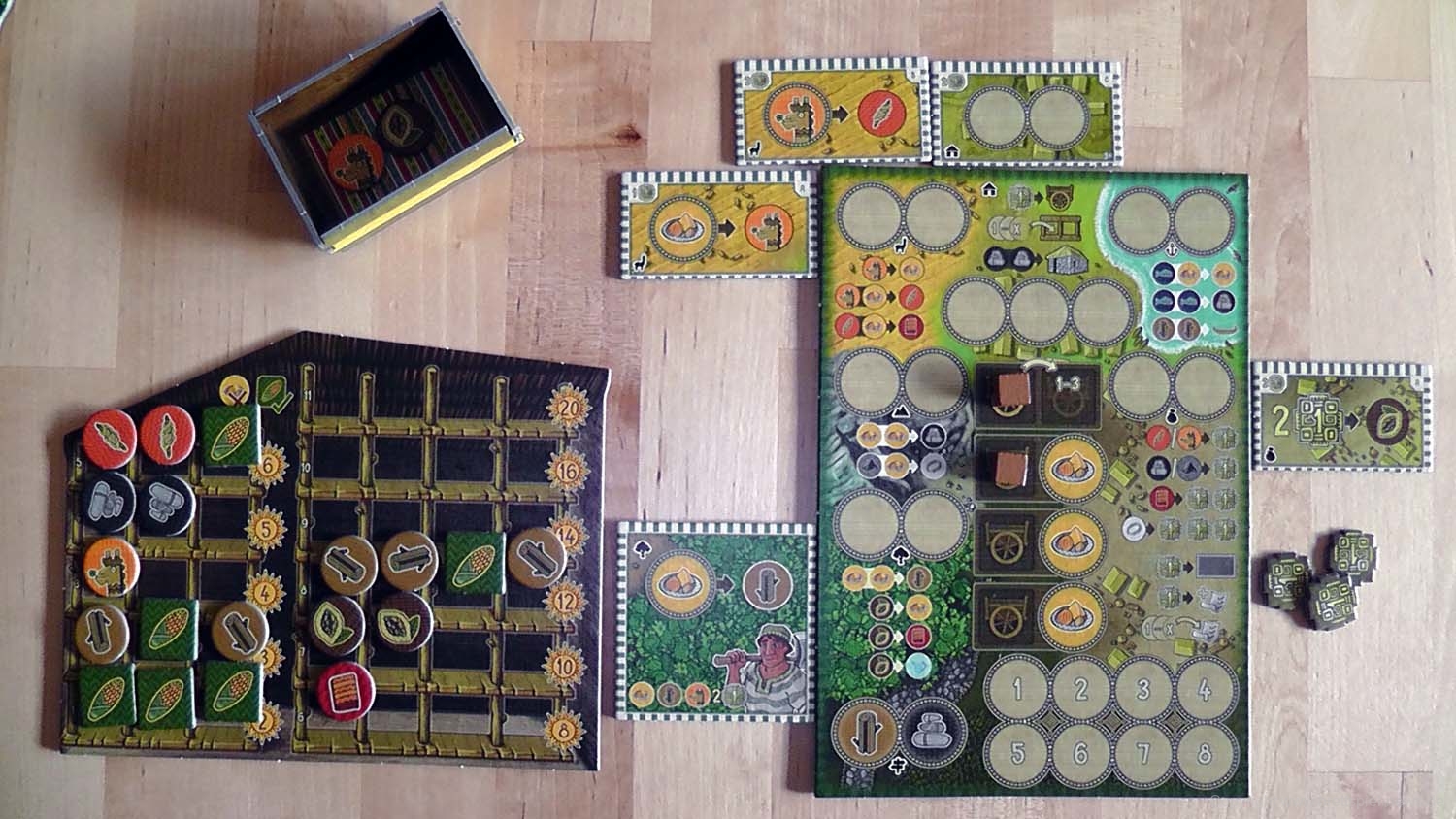 Ein wichtiger Teil des Spiels ist das Füllen des Lagerhauses. Als Dorfaktion können SpielerInnen jederzeit Waren auslagern. Sobald ein Plättchen ausgelagert wurde, steht es bis zum Ende des Spiels nicht mehr zur Verfügung. So muss genau überlegt werden, auf welche Ressource schon verzichtet werden kann und welche noch für Aktionen benötigt wird. Je geschickter die einzelnen Lagerreihen gefüllt werden, desto mehr Siegpunkte gibt es am Spielende. Pro komplett gefüllter Reihe werden Siegpunkte vergeben. Das Einlagern startet in der untersten, am wenigsten wertvollen Reihe. Die einzelnen Ressourcen werden so sortiert, dass pro Reihe nur eine Art Ressource gelagert wird und pro Art nur eine Lagerreihe begonnen werden kann. Erst wenn eine Reihe vollständig gefüllt ist, kann die gleiche Ressource in einer neuen Reihe gelagert werden. Hier hilft Mais weiter, denn Mais darf als Lückenfüller genutzt werden.