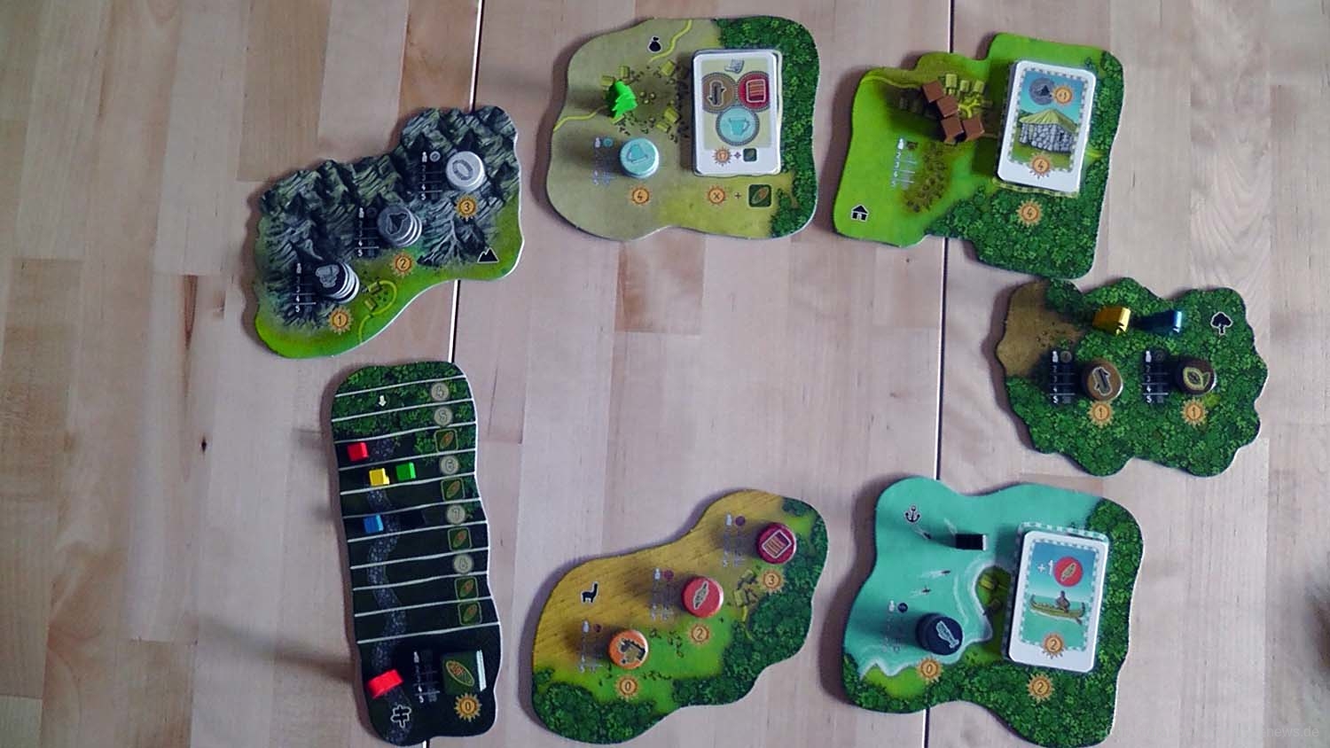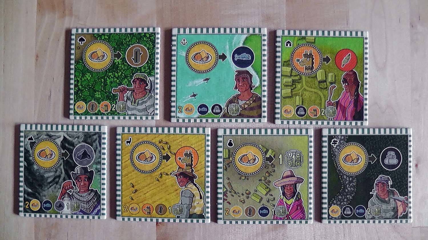 Die Gestaltung und das Thema des Spiels sind sehr ansprechend. Allerdings darf hier kein thematisches Spiel erwartet werden. SpielerInnen verbrauchen, tauschen und verkaufen hier nicht wirklich Rohstoffe. Auf dem Markt wird ein Stein vor gezeigt. Dieser wird zurück in den eigenen Vorrat gelegt und zwei Münzen werden ausgezahlt. Genauso wird im Wald ein Kakaoplättchen nur gezeigt. Dafür erhalten die SpielerInnen ein Glas. Das wirkt alles sehr unthematisch, aber es funktioniert mechanisch wunderbar. Die Härte der Region in den Anden ist trotzdem gut wiedergegeben worden. SpielerInnen planen Aktionen genau, bewegen sich mühsam zu neuen Orten, optimieren stets die eigenen Vorräte und stellen sich den wechselnden Herausforderungen, vor die sie das Plättchenziehen in jeder Runde stellt. Das macht viel Spaß, verzeiht Fehler nur langsam und lässt die SpielerInnen am Spielende erschöpft und stolz auf das eigene Lagerhaus blicken.
